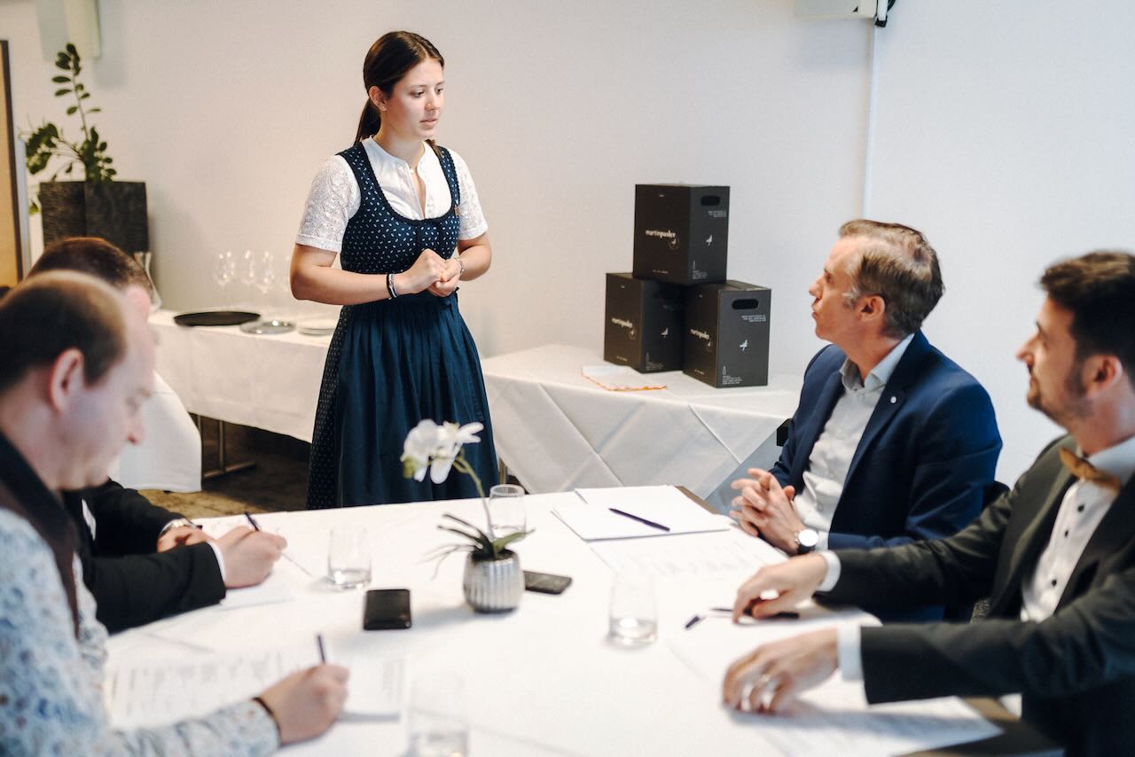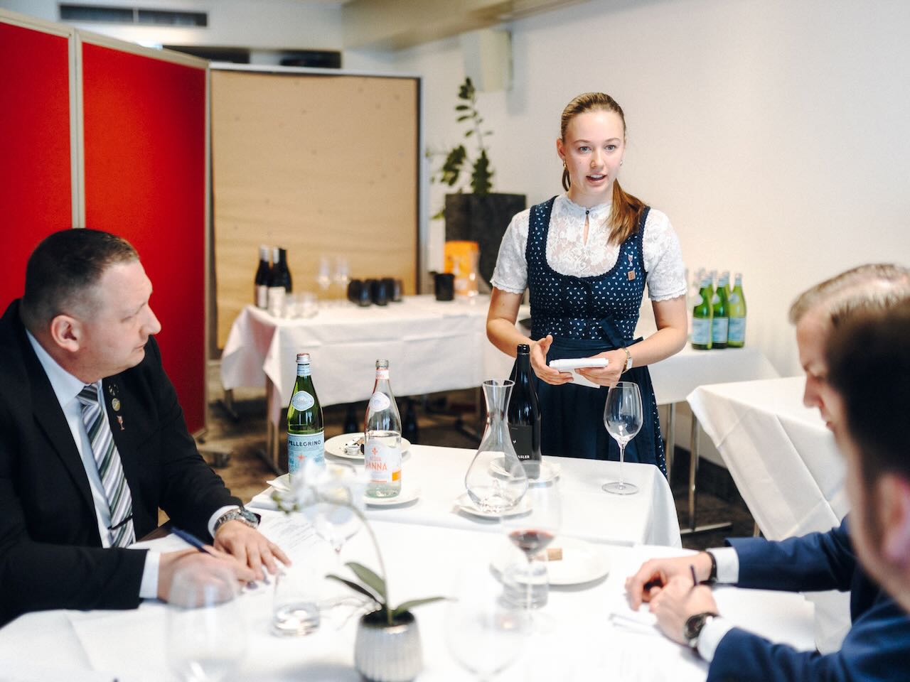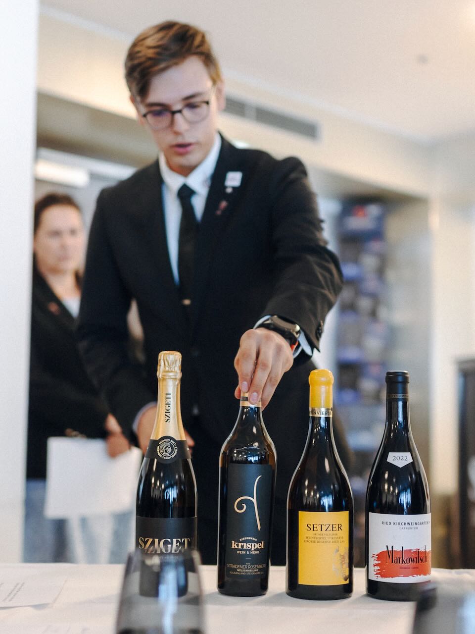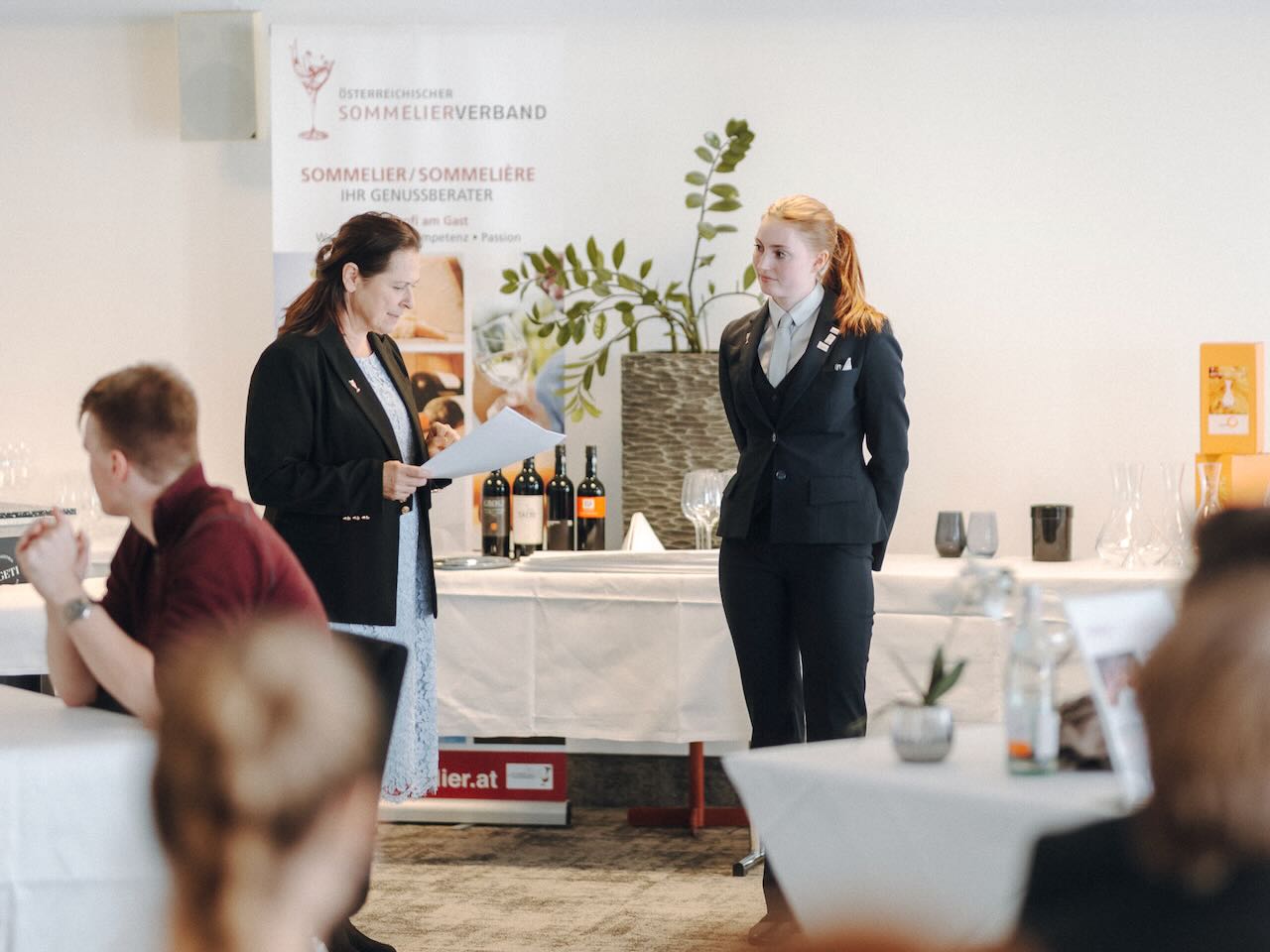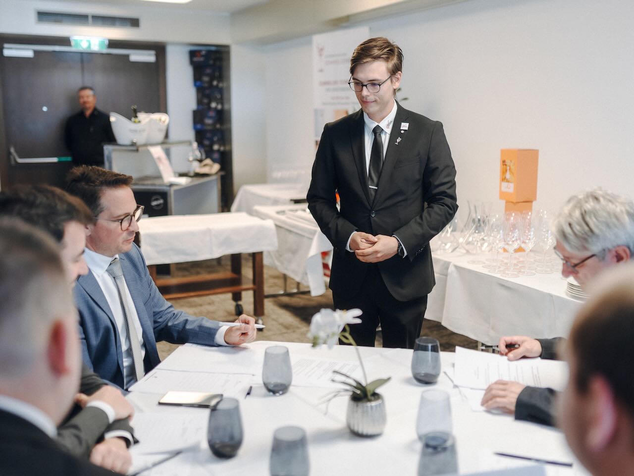 Als erste Aufgabe galt es einen umfassenden Fragebogen auszufüllen, der etwa die klassifizierten Rebsorten österreichischer DAC-Gebiete, das Benennen von Flaschengrößen, das Verorten von namhaften Rieden inklusive Winzer*in, Kellertechnik und allgemeine Getränkekunde umfasste. Beim praktischen Teil war eine Flasche Rotwein zu servieren und auf den kniffligen Änderungswunsch eines Gastes einzugehen.