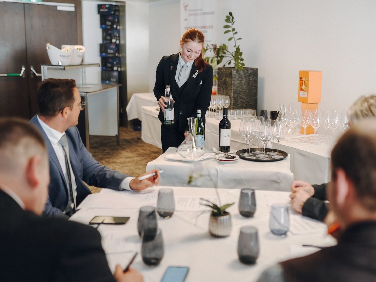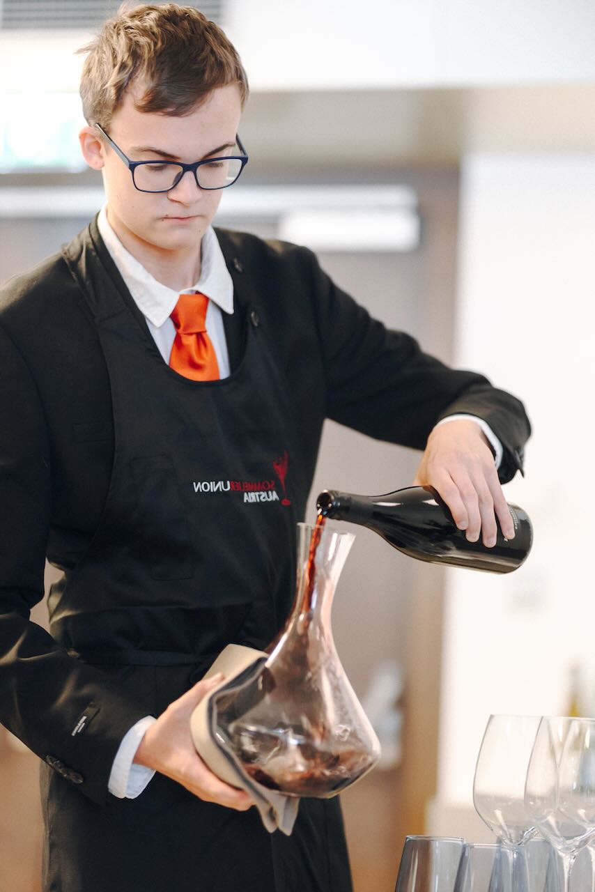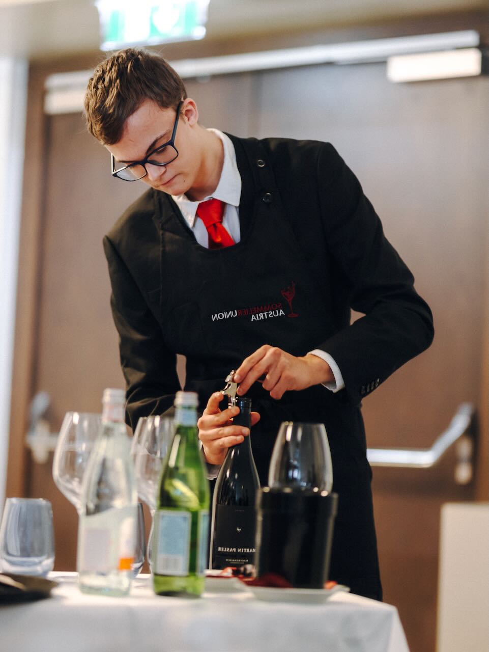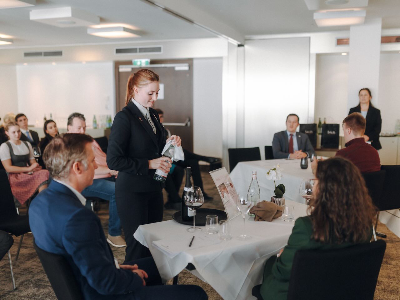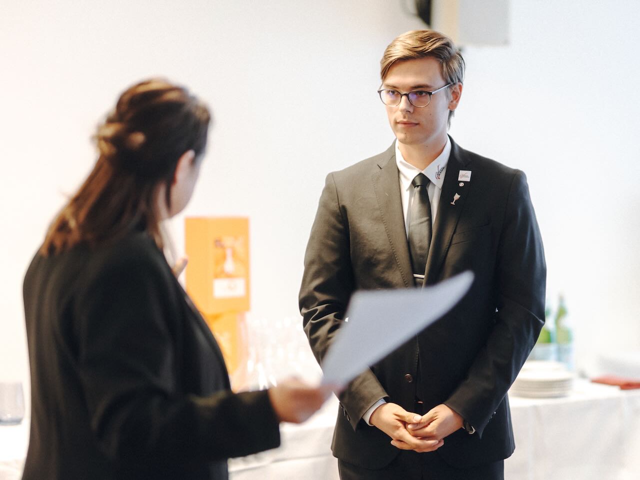 Als erste Aufgabe galt es einen umfassenden Fragebogen auszufüllen, der etwa die klassifizierten Rebsorten österreichischer DAC-Gebiete, das Benennen von Flaschengrößen, das Verorten von namhaften Rieden inklusive Winzer*in, Kellertechnik und allgemeine Getränkekunde umfasste. Beim praktischen Teil war eine Flasche Rotwein zu servieren und auf den kniffligen Änderungswunsch eines Gastes einzugehen.