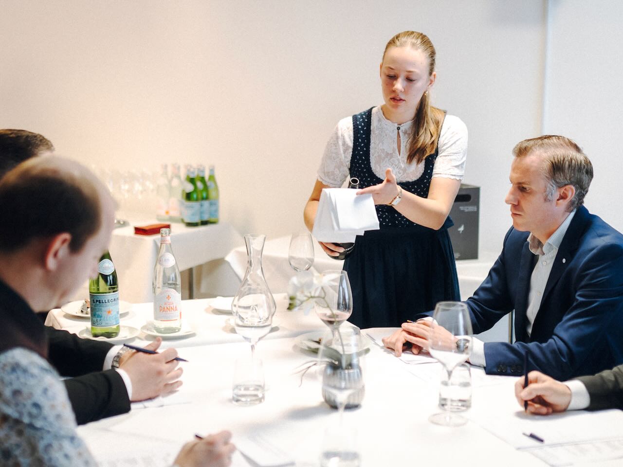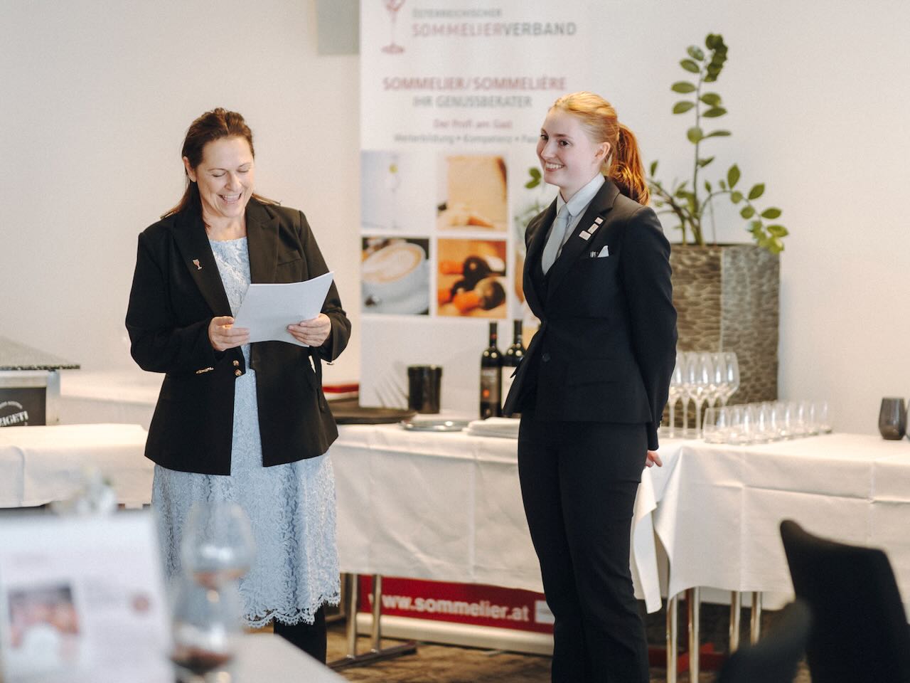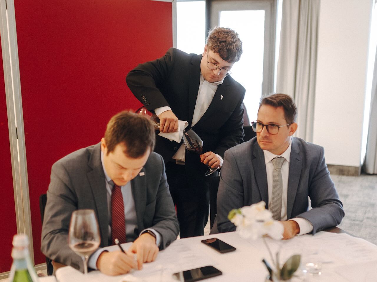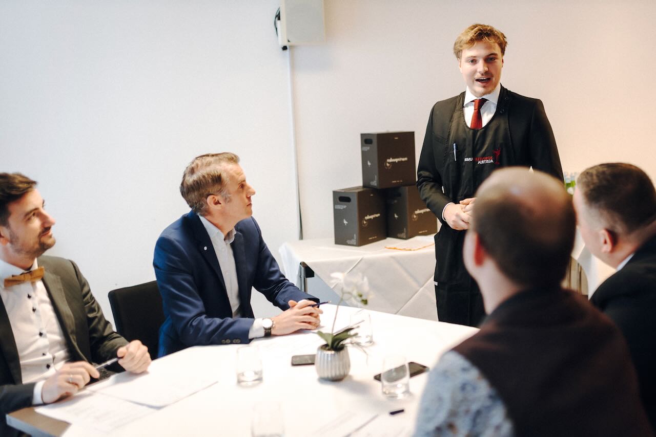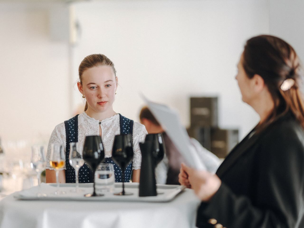 Als erste Aufgabe galt es einen umfassenden Fragebogen auszufüllen, der etwa die klassifizierten Rebsorten österreichischer DAC-Gebiete, das Benennen von Flaschengrößen, das Verorten von namhaften Rieden inklusive Winzer*in, Kellertechnik und allgemeine Getränkekunde umfasste. Beim praktischen Teil war eine Flasche Rotwein zu servieren und auf den kniffligen Änderungswunsch eines Gastes einzugehen.