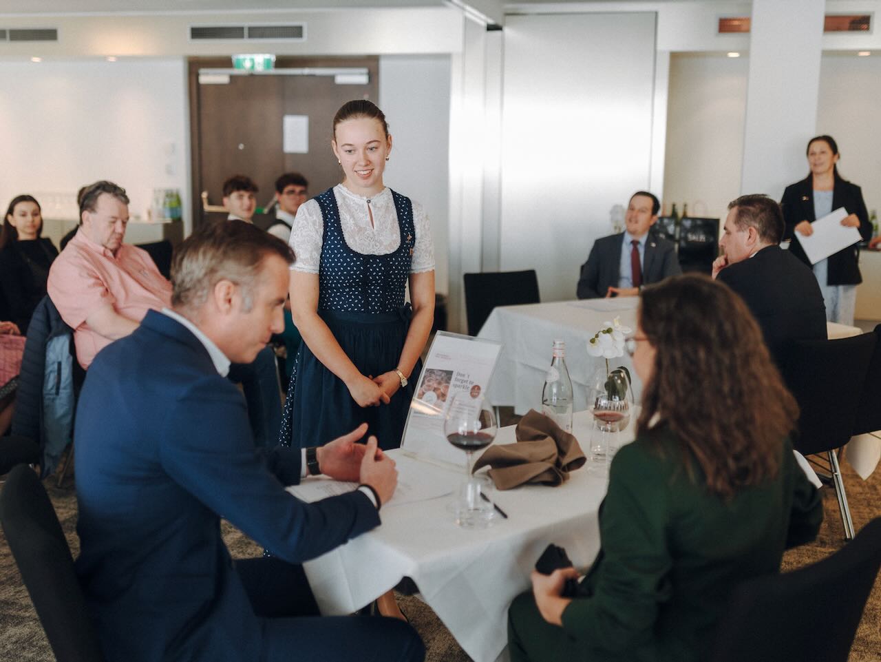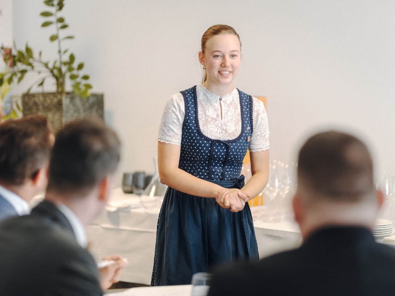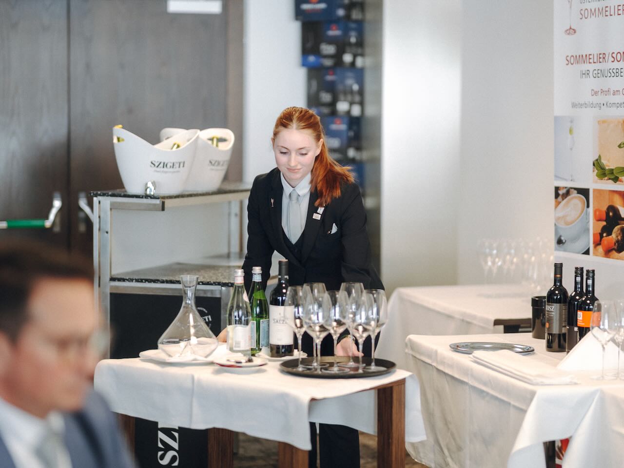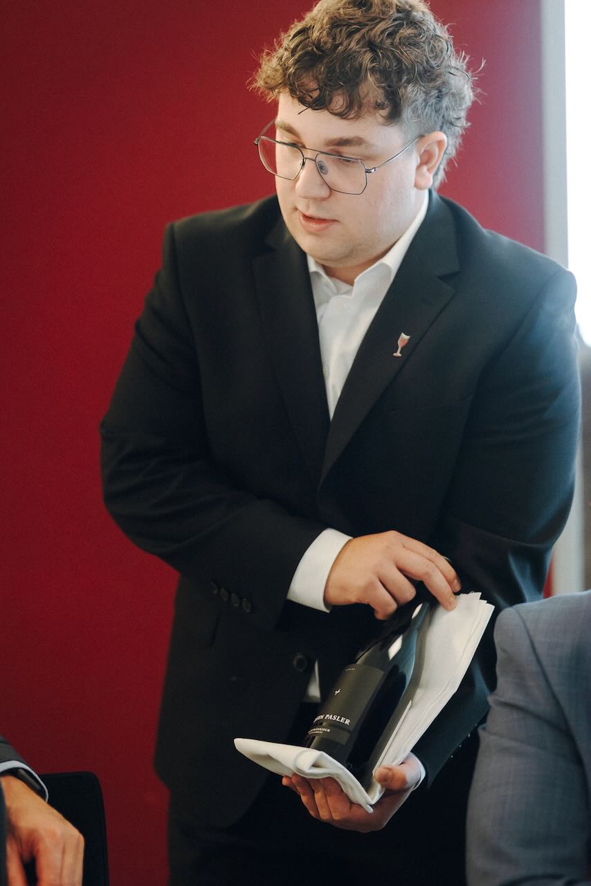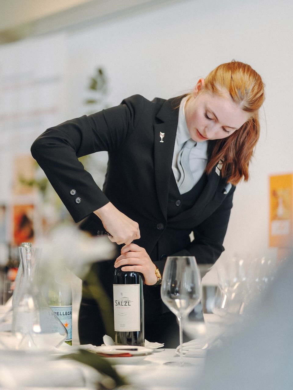 Als erste Aufgabe galt es einen umfassenden Fragebogen auszufüllen, der etwa die klassifizierten Rebsorten österreichischer DAC-Gebiete, das Benennen von Flaschengrößen, das Verorten von namhaften Rieden inklusive Winzer*in, Kellertechnik und allgemeine Getränkekunde umfasste. Beim praktischen Teil war eine Flasche Rotwein zu servieren und auf den kniffligen Änderungswunsch eines Gastes einzugehen.