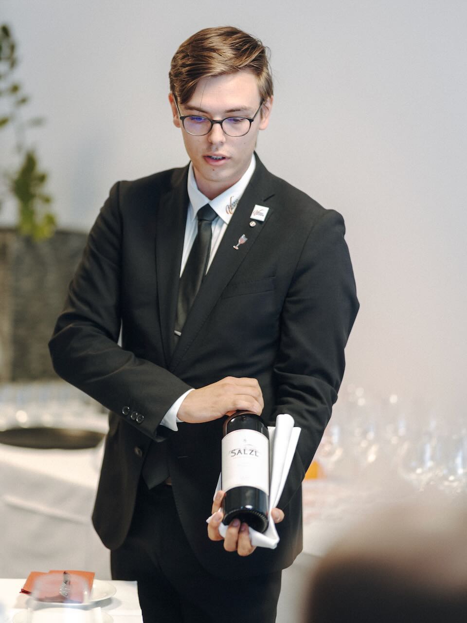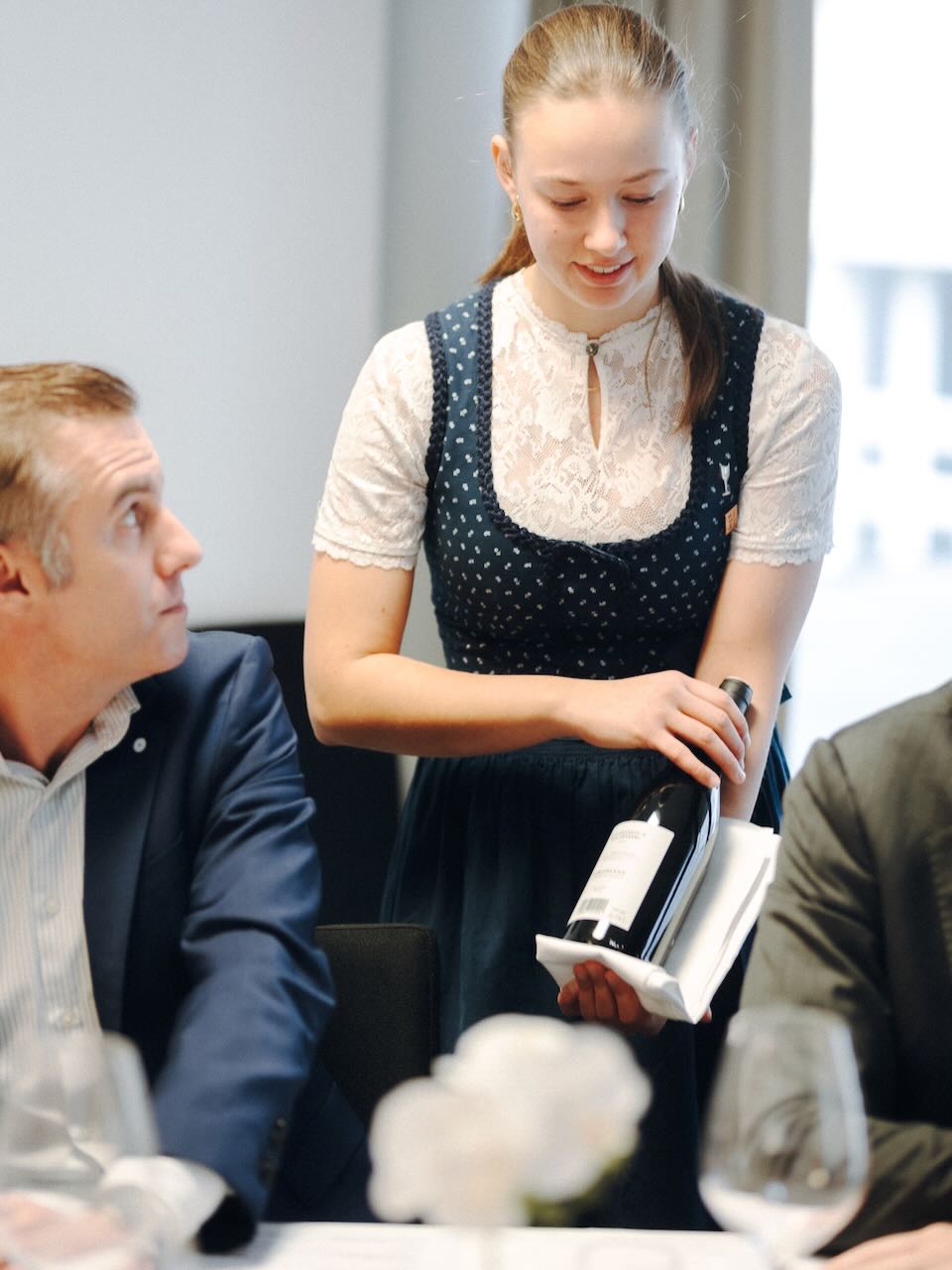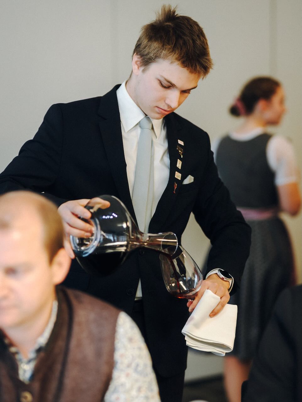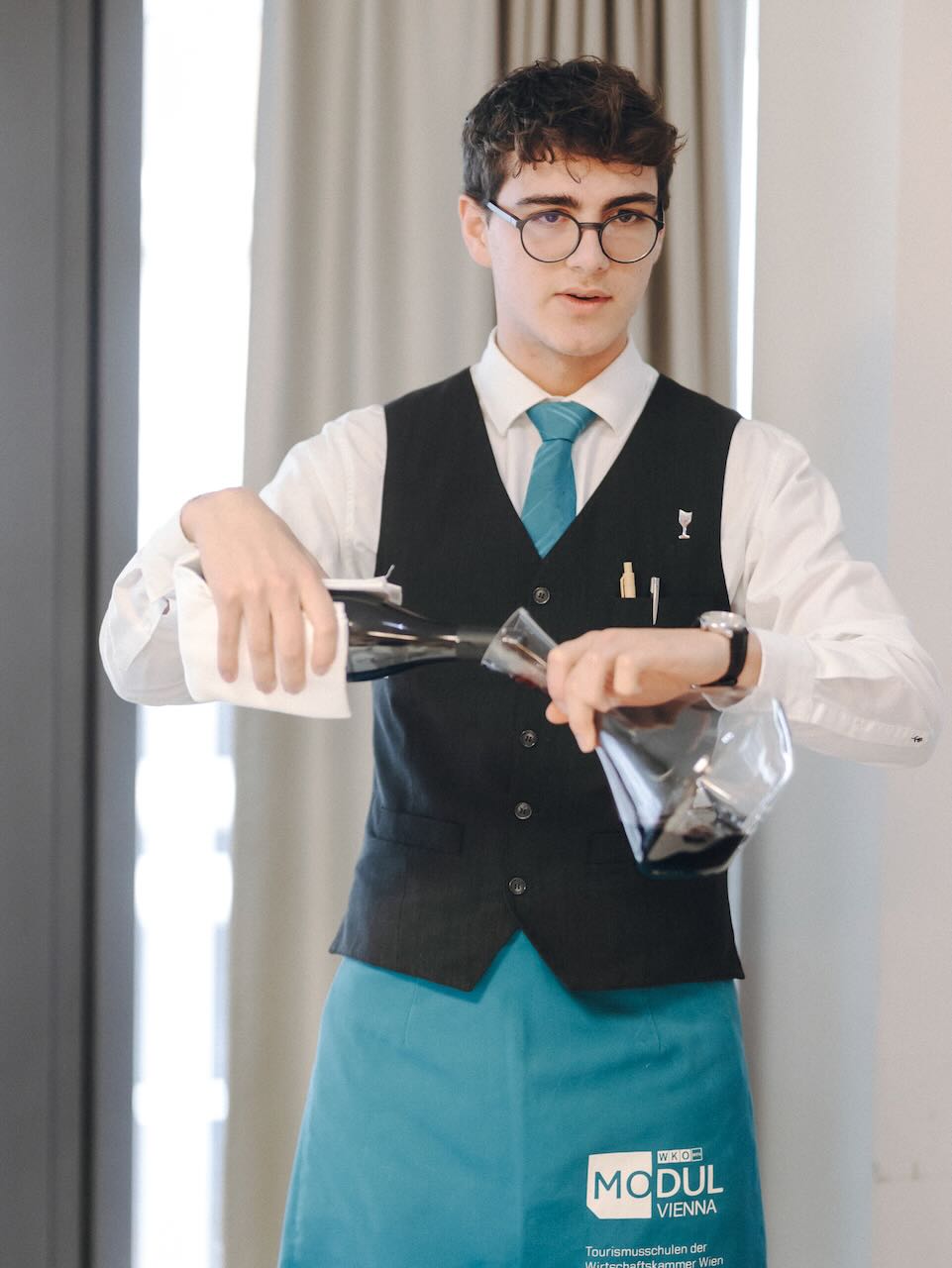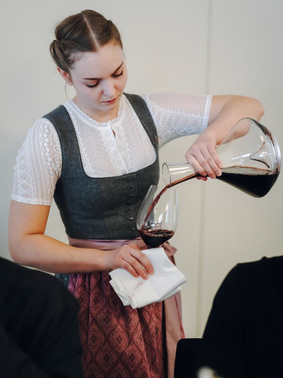Als erste Aufgabe galt es einen umfassenden Fragebogen auszufüllen, der etwa die klassifizierten Rebsorten österreichischer DAC-Gebiete, das Benennen von Flaschengrößen, das Verorten von namhaften Rieden inklusive Winzer*in, Kellertechnik und allgemeine Getränkekunde umfasste. Beim praktischen Teil war eine Flasche Rotwein zu servieren und auf den kniffligen Änderungswunsch eines Gastes einzugehen.