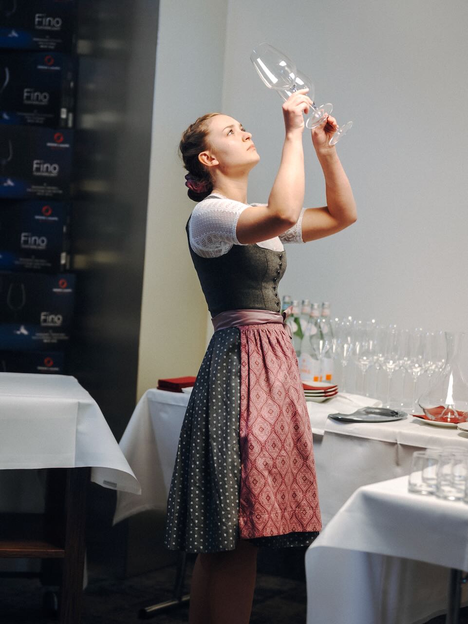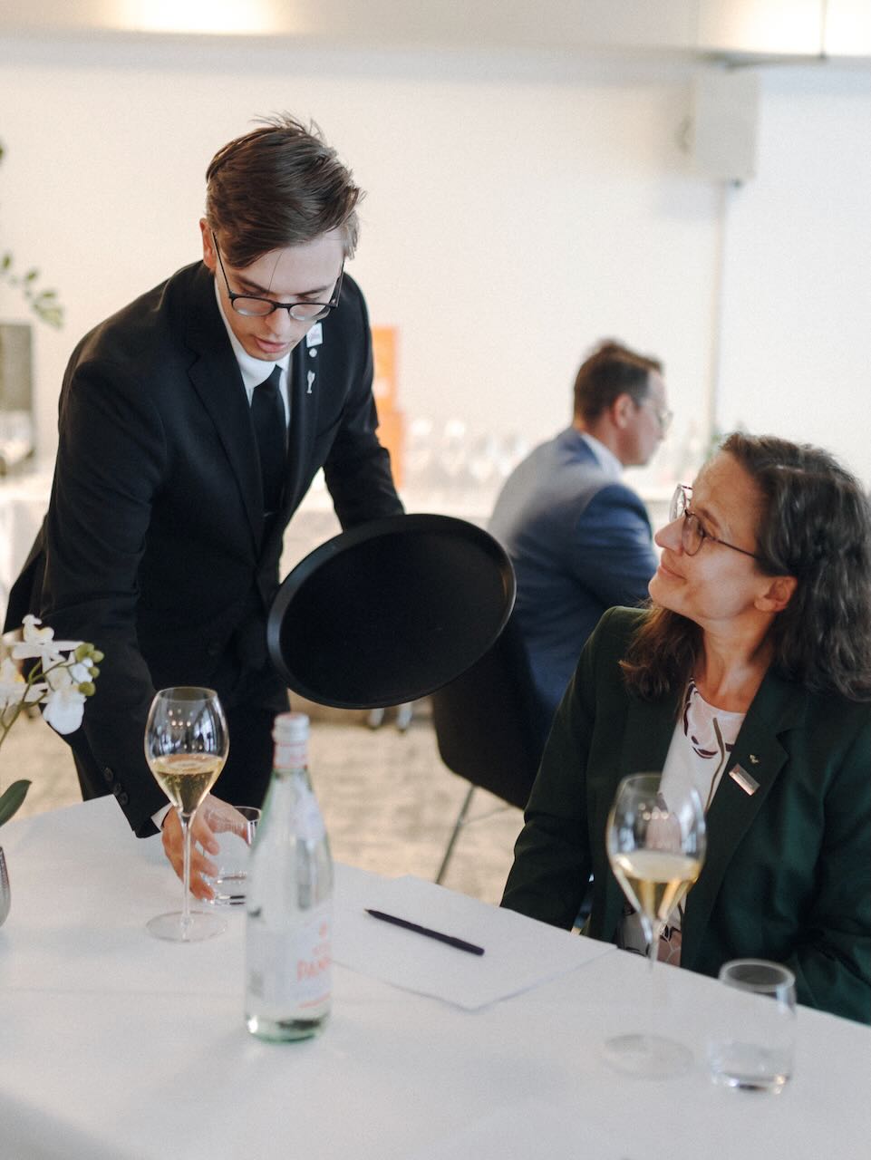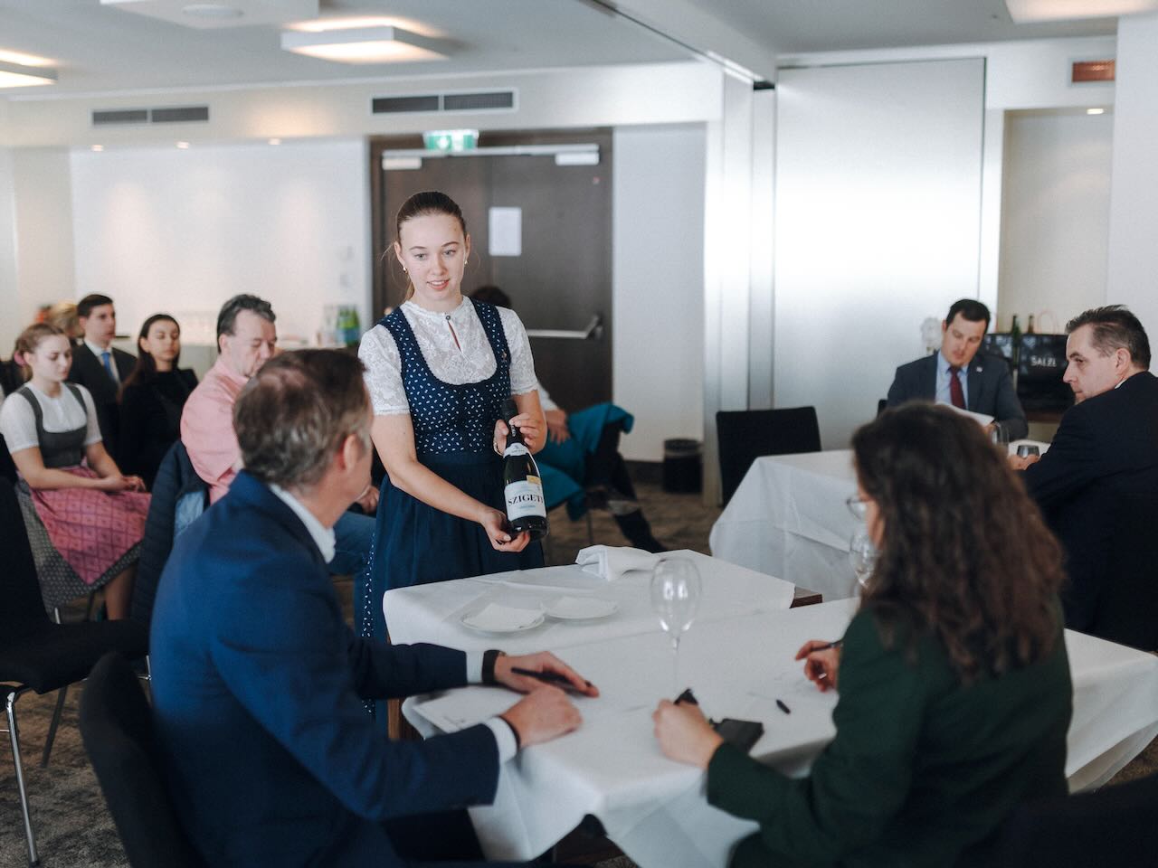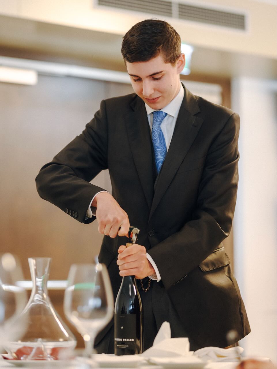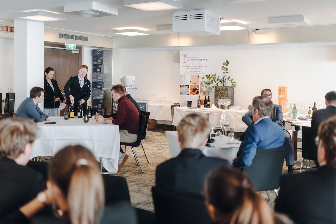 Als erste Aufgabe galt es einen umfassenden Fragebogen auszufüllen, der etwa die klassifizierten Rebsorten österreichischer DAC-Gebiete, das Benennen von Flaschengrößen, das Verorten von namhaften Rieden inklusive Winzer*in, Kellertechnik und allgemeine Getränkekunde umfasste. Beim praktischen Teil war eine Flasche Rotwein zu servieren und auf den kniffligen Änderungswunsch eines Gastes einzugehen.