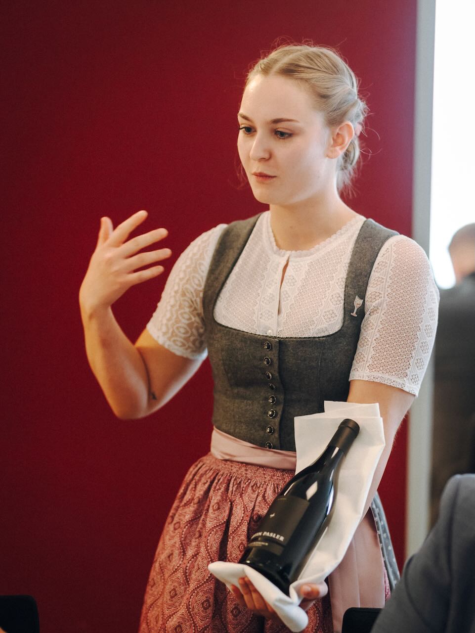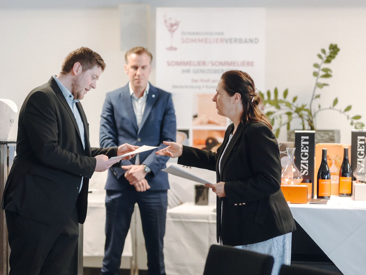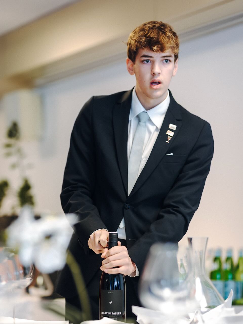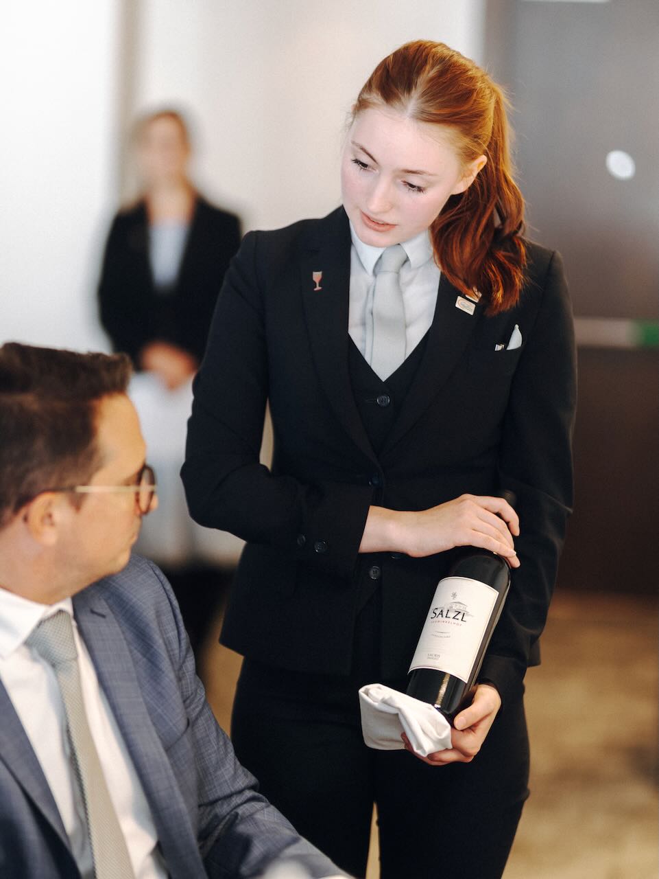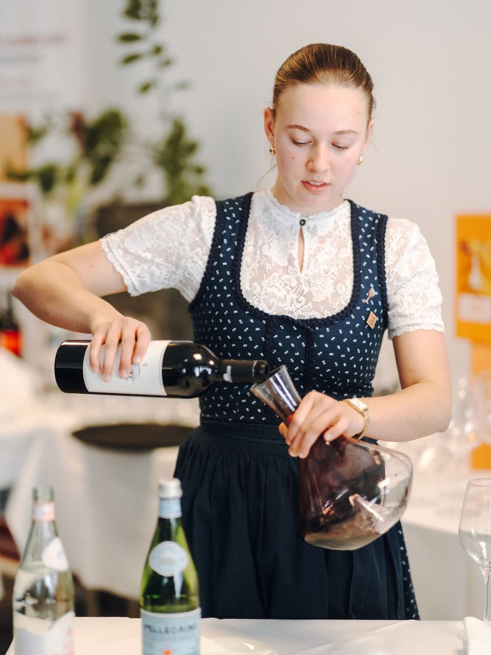 Als erste Aufgabe galt es einen umfassenden Fragebogen auszufüllen, der etwa die klassifizierten Rebsorten österreichischer DAC-Gebiete, das Benennen von Flaschengrößen, das Verorten von namhaften Rieden inklusive Winzer*in, Kellertechnik und allgemeine Getränkekunde umfasste. Beim praktischen Teil war eine Flasche Rotwein zu servieren und auf den kniffligen Änderungswunsch eines Gastes einzugehen.