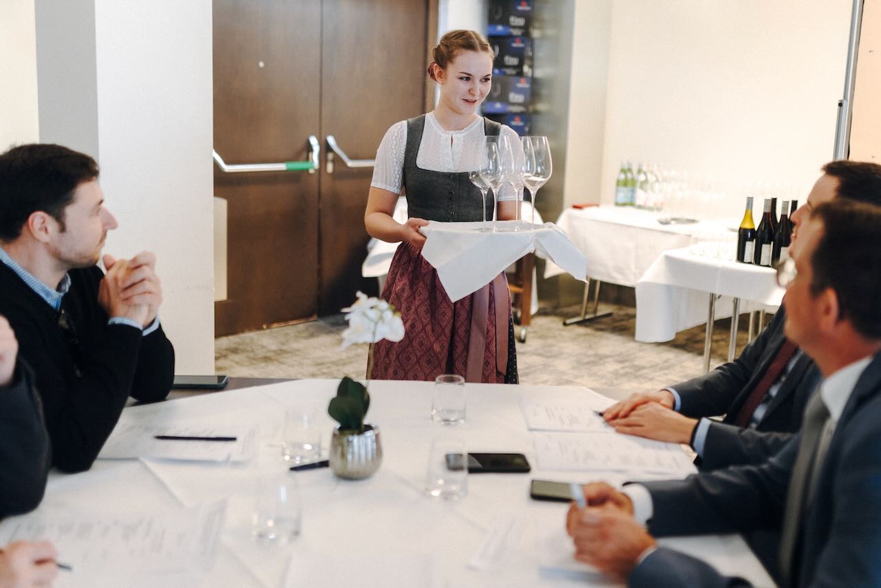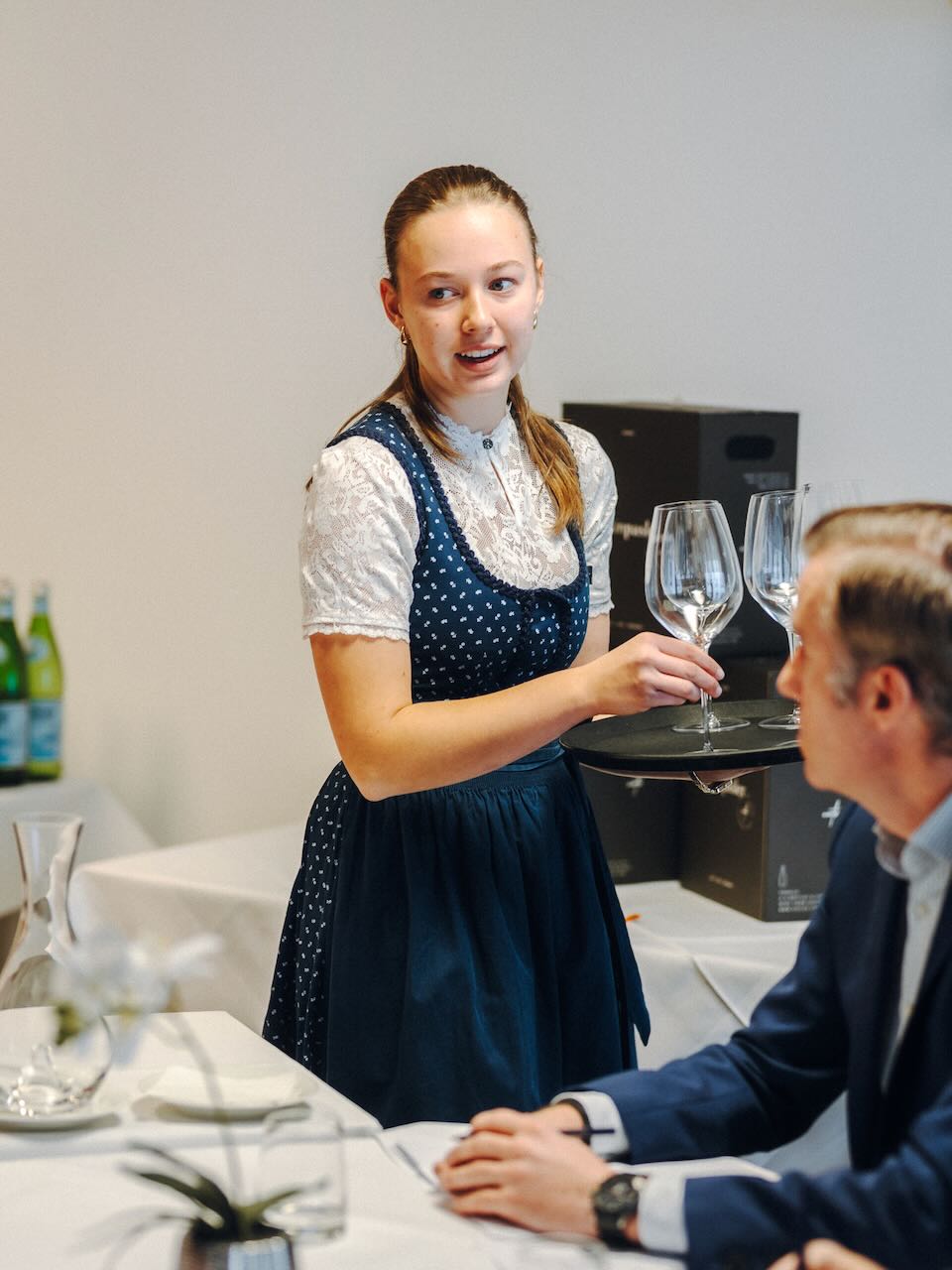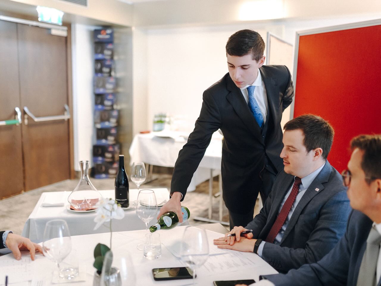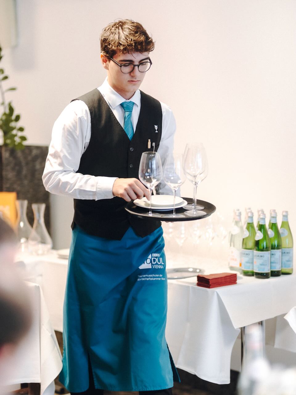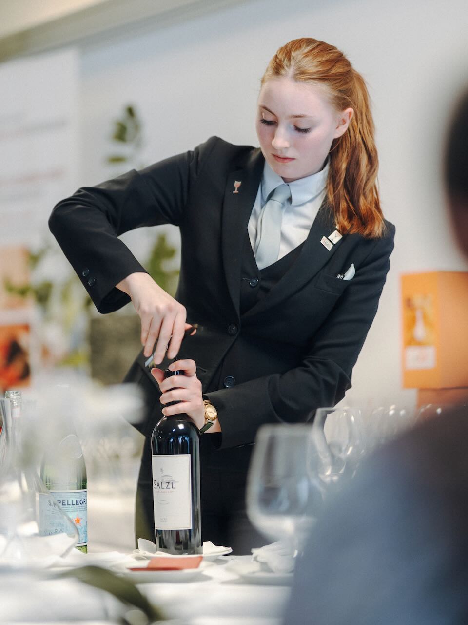 Als erste Aufgabe galt es einen umfassenden Fragebogen auszufüllen, der etwa die klassifizierten Rebsorten österreichischer DAC-Gebiete, das Benennen von Flaschengrößen, das Verorten von namhaften Rieden inklusive Winzer*in, Kellertechnik und allgemeine Getränkekunde umfasste. Beim praktischen Teil war eine Flasche Rotwein zu servieren und auf den kniffligen Änderungswunsch eines Gastes einzugehen.