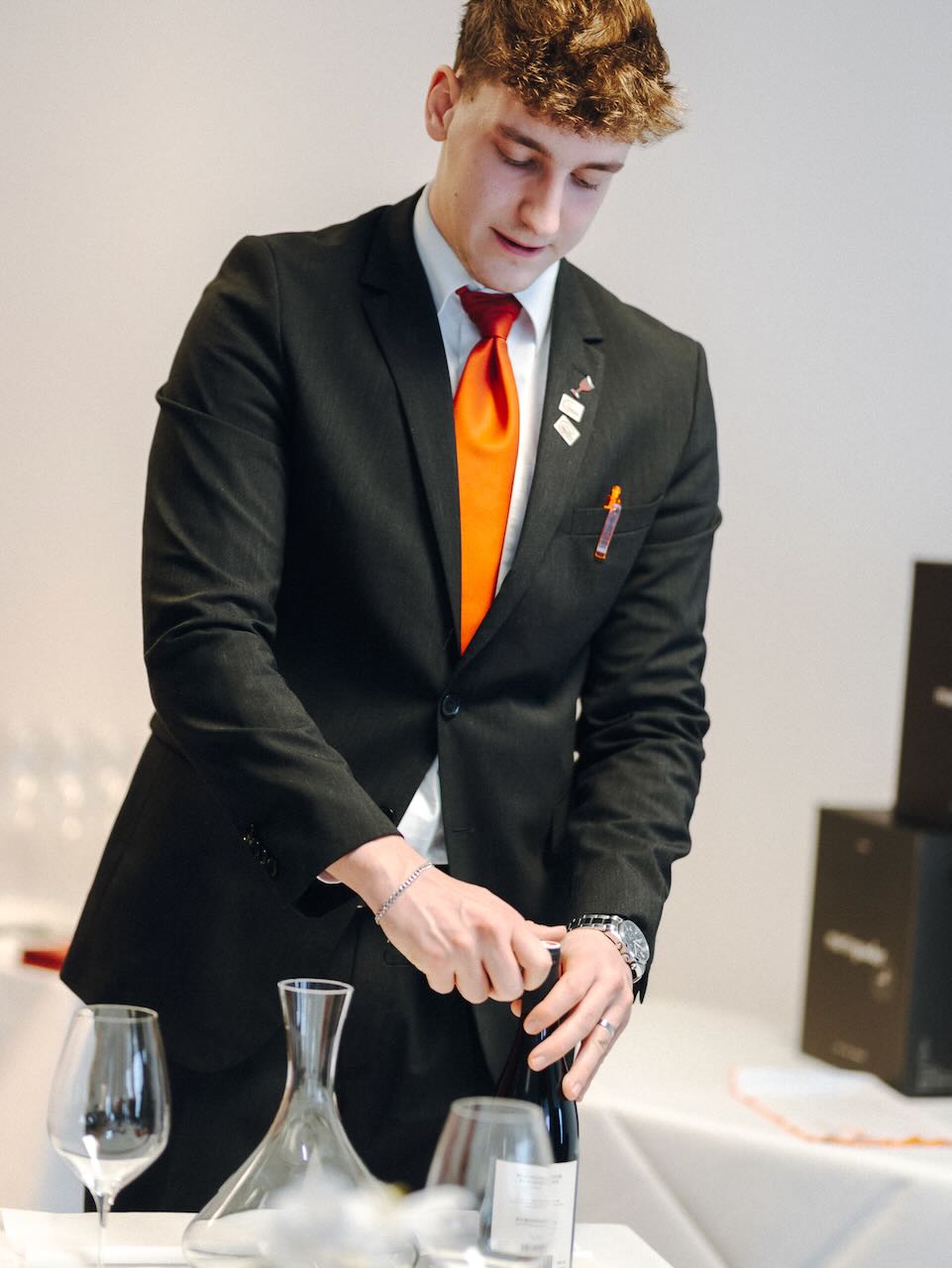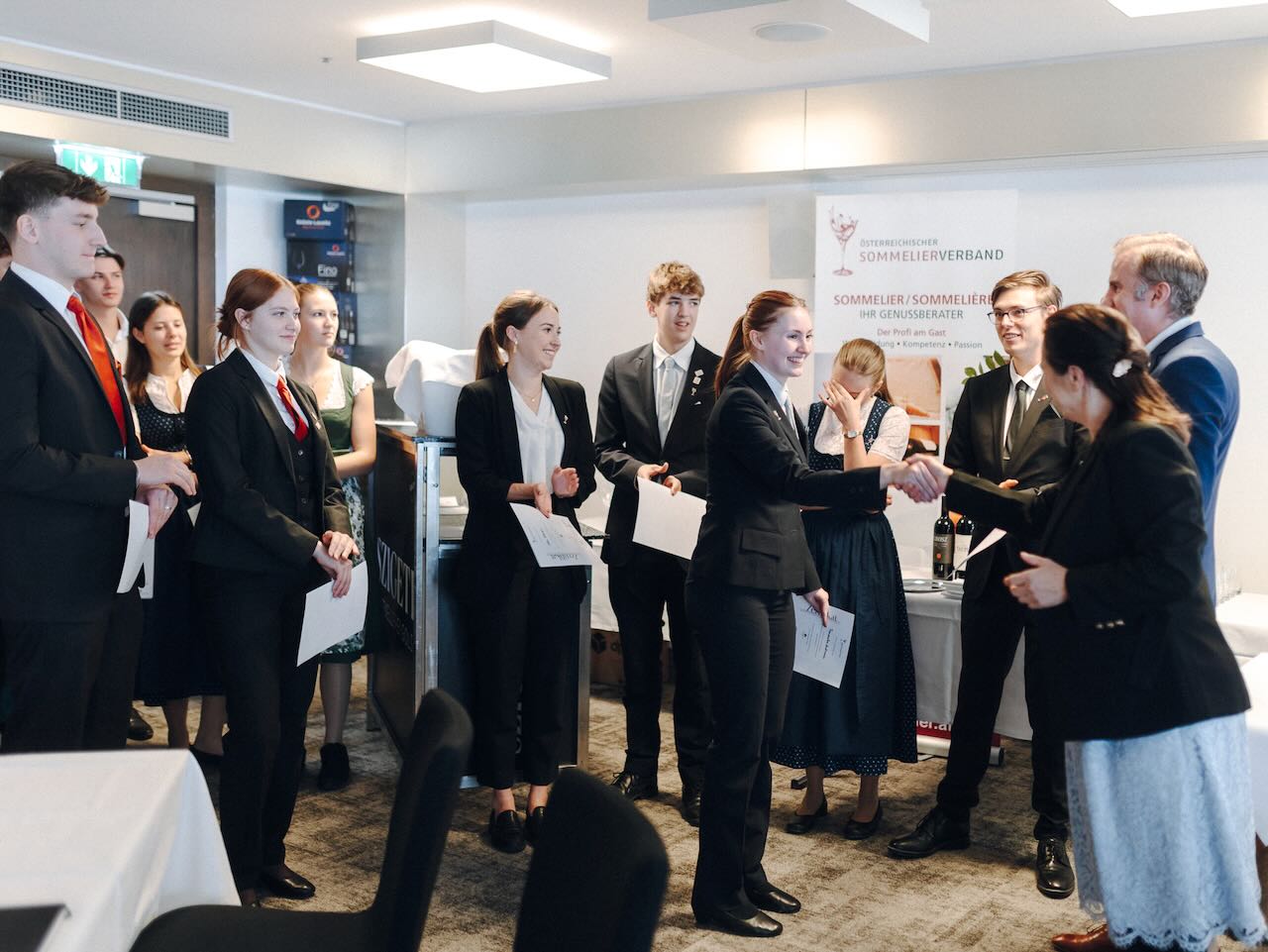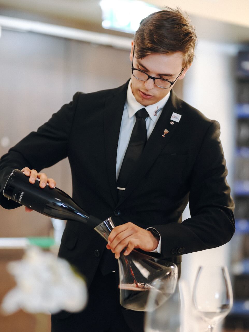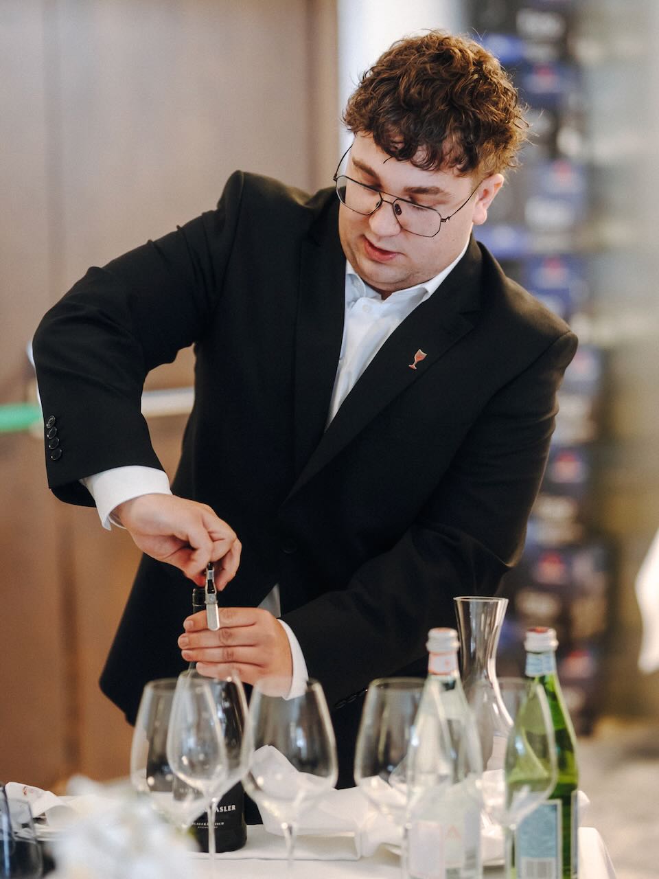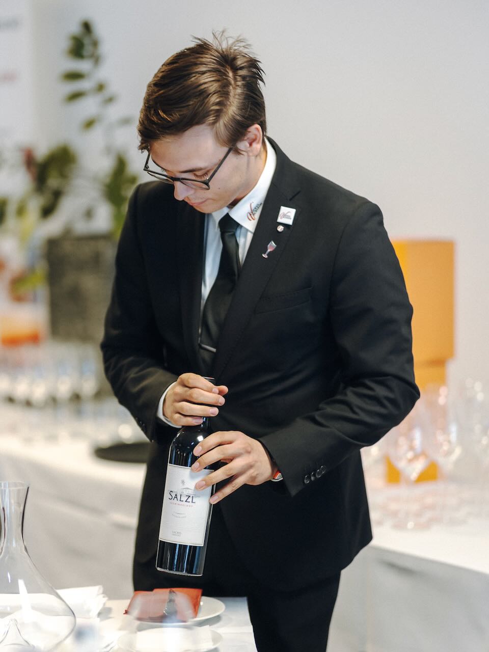 Als erste Aufgabe galt es einen umfassenden Fragebogen auszufüllen, der etwa die klassifizierten Rebsorten österreichischer DAC-Gebiete, das Benennen von Flaschengrößen, das Verorten von namhaften Rieden inklusive Winzer*in, Kellertechnik und allgemeine Getränkekunde umfasste. Beim praktischen Teil war eine Flasche Rotwein zu servieren und auf den kniffligen Änderungswunsch eines Gastes einzugehen.