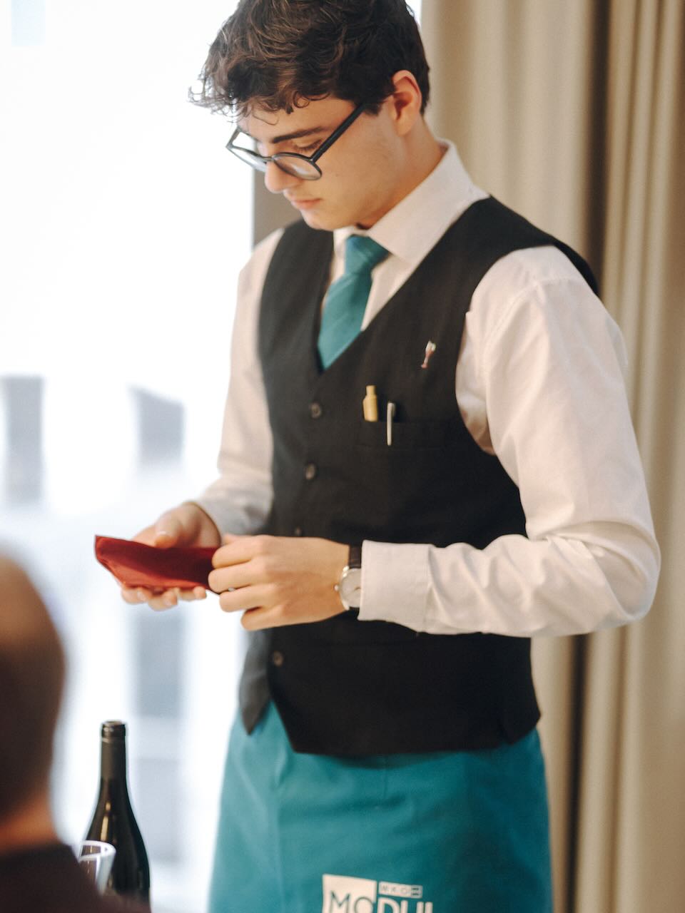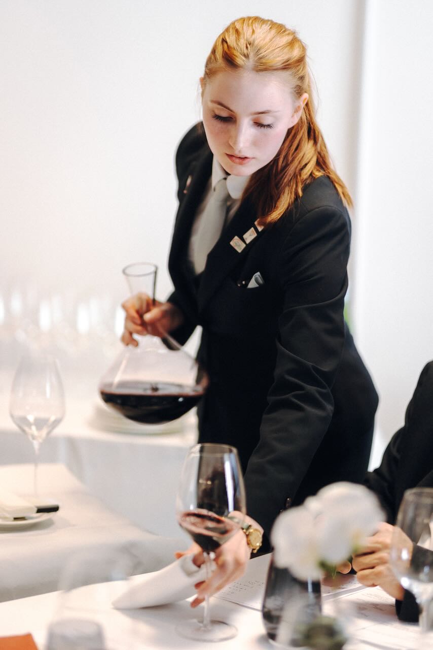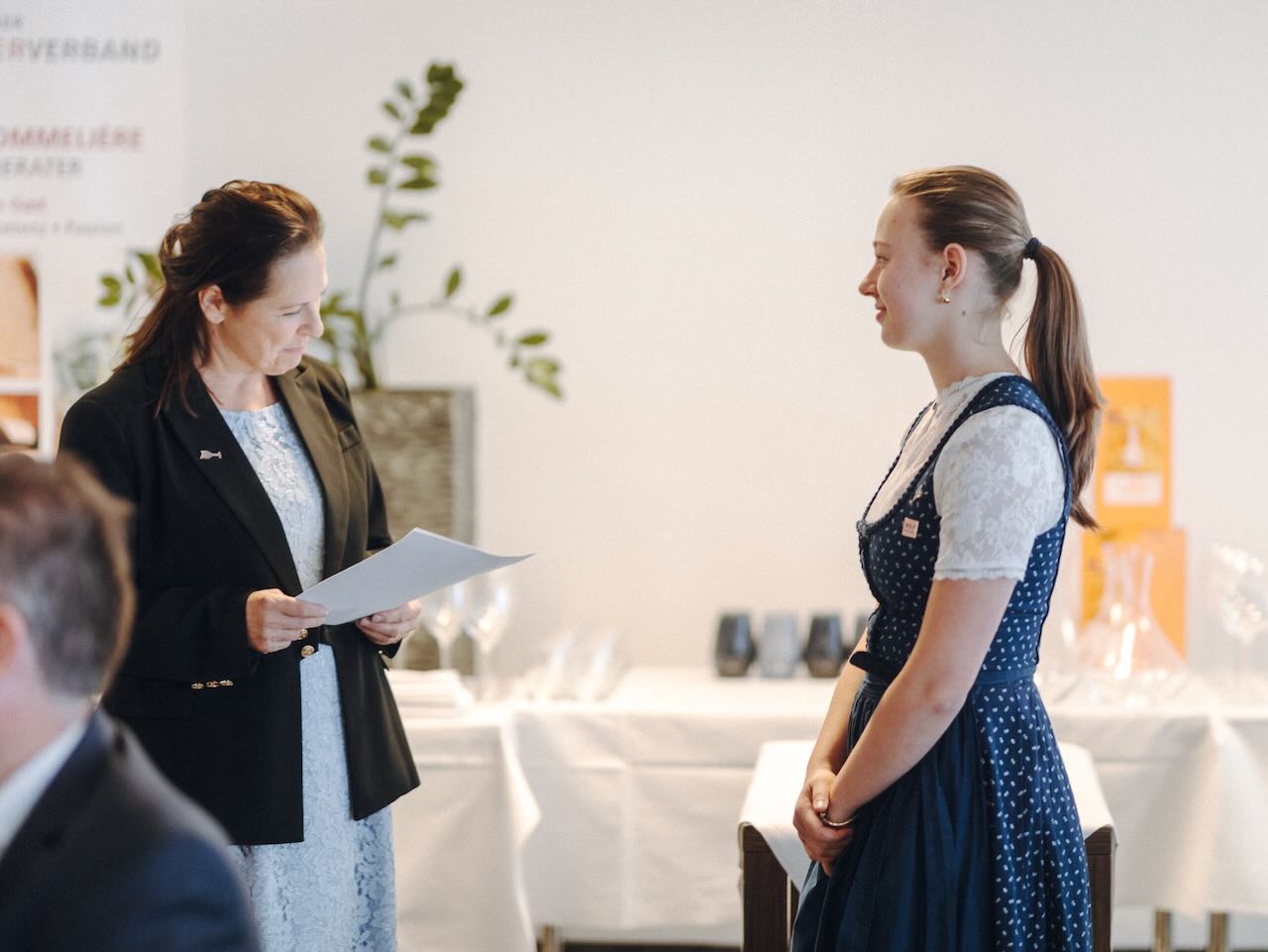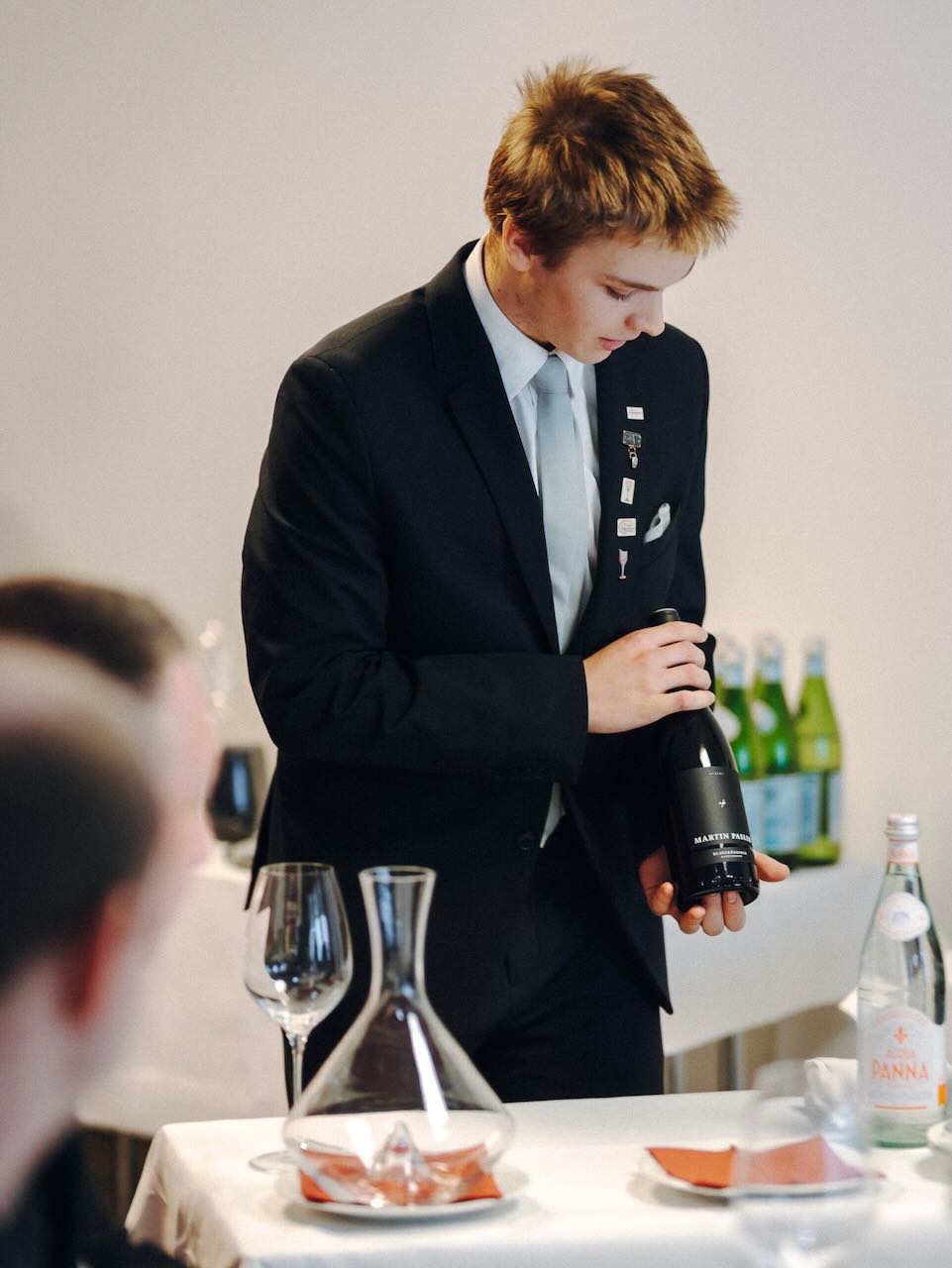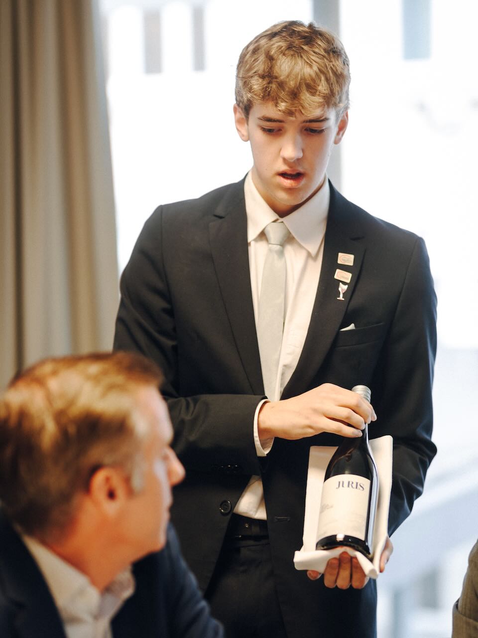 Als erste Aufgabe galt es einen umfassenden Fragebogen auszufüllen, der etwa die klassifizierten Rebsorten österreichischer DAC-Gebiete, das Benennen von Flaschengrößen, das Verorten von namhaften Rieden inklusive Winzer*in, Kellertechnik und allgemeine Getränkekunde umfasste. Beim praktischen Teil war eine Flasche Rotwein zu servieren und auf den kniffligen Änderungswunsch eines Gastes einzugehen.