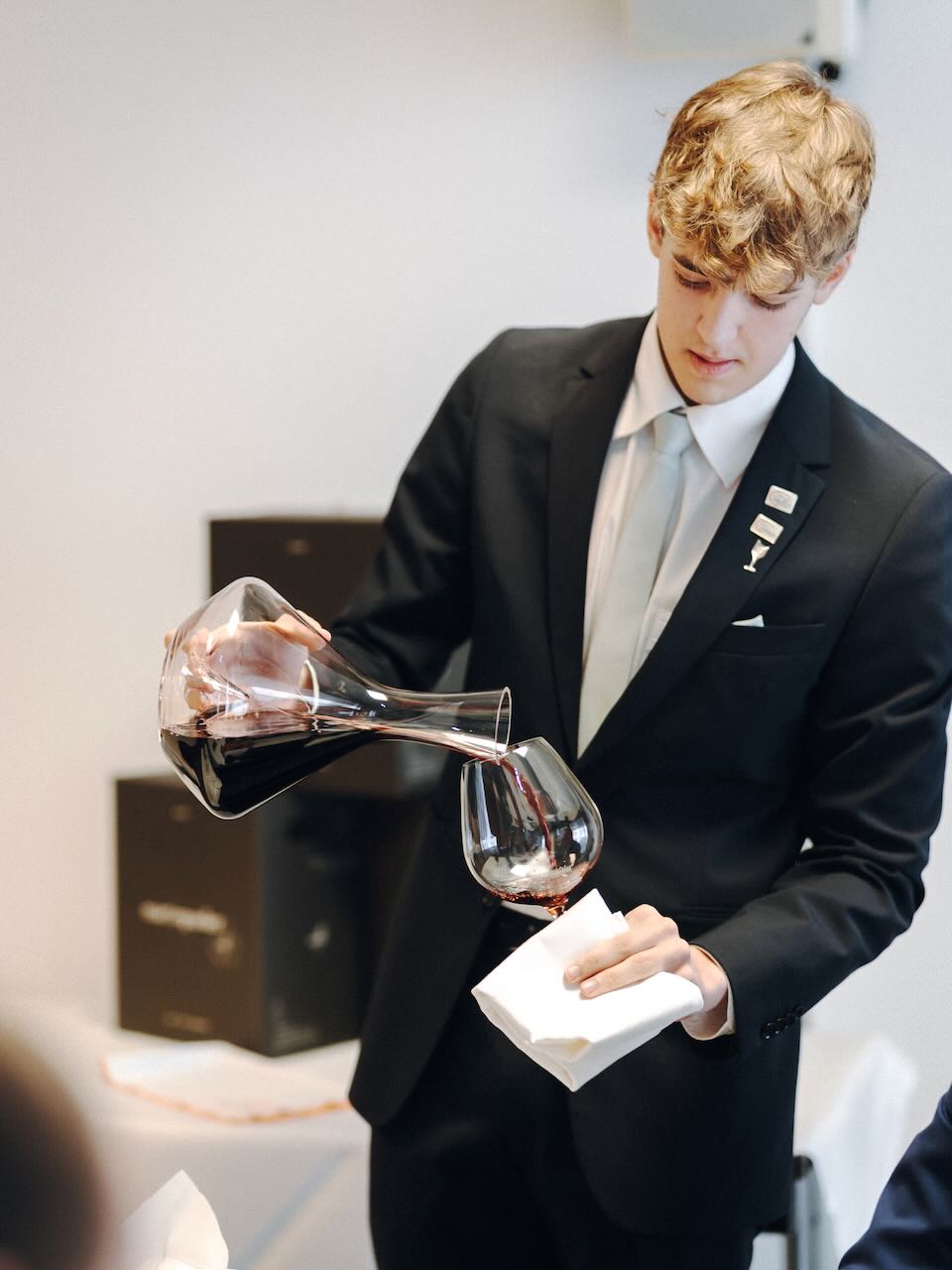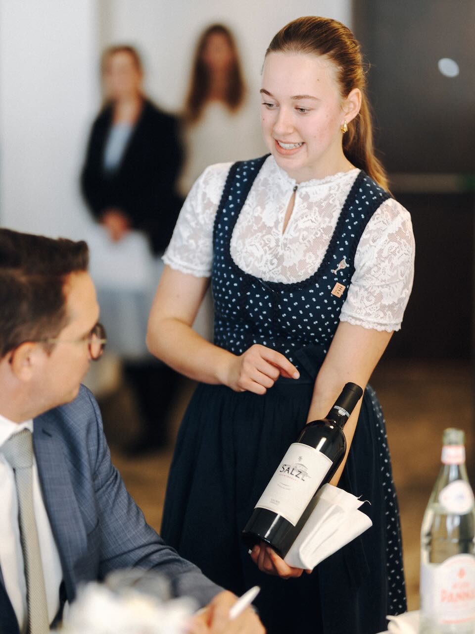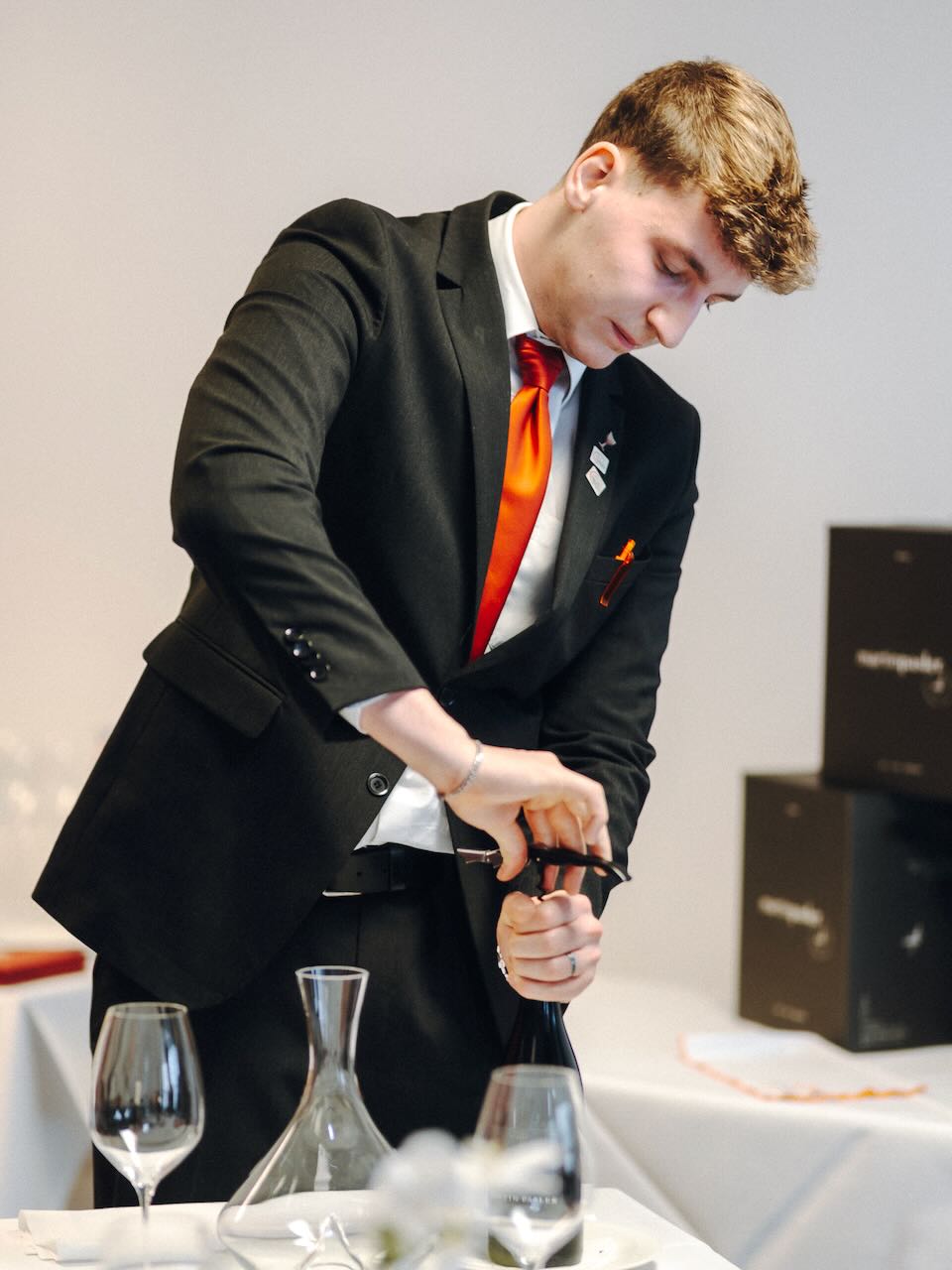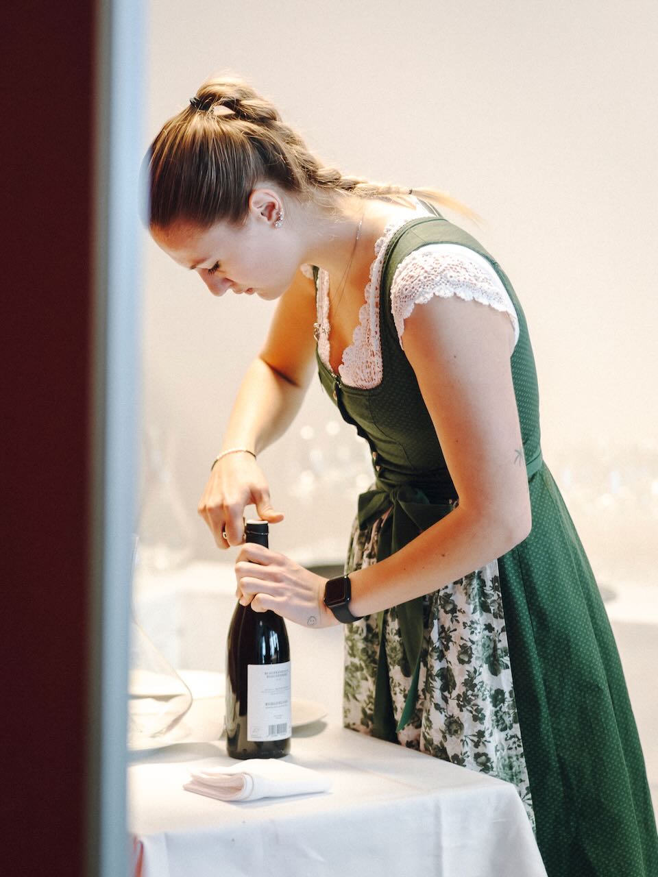 Als erste Aufgabe galt es einen umfassenden Fragebogen auszufüllen, der etwa die klassifizierten Rebsorten österreichischer DAC-Gebiete, das Benennen von Flaschengrößen, das Verorten von namhaften Rieden inklusive Winzer*in, Kellertechnik und allgemeine Getränkekunde umfasste. Beim praktischen Teil war eine Flasche Rotwein zu servieren und auf den kniffligen Änderungswunsch eines Gastes einzugehen.