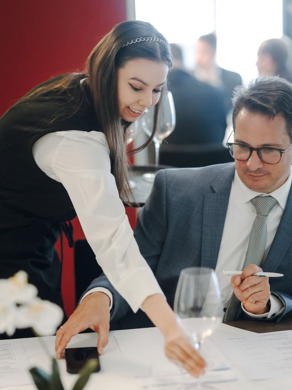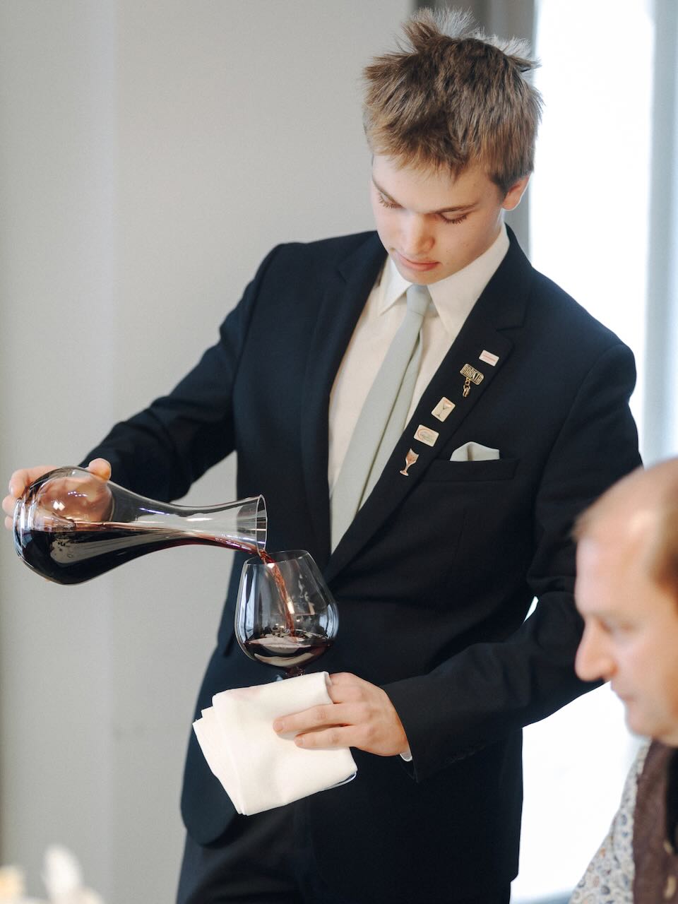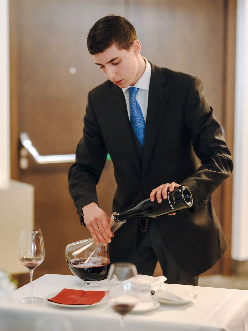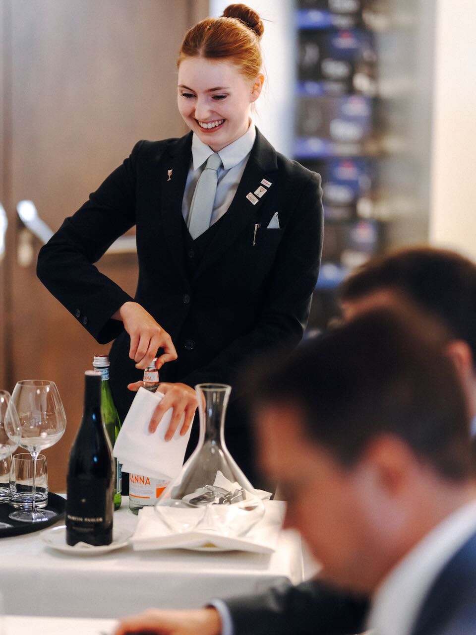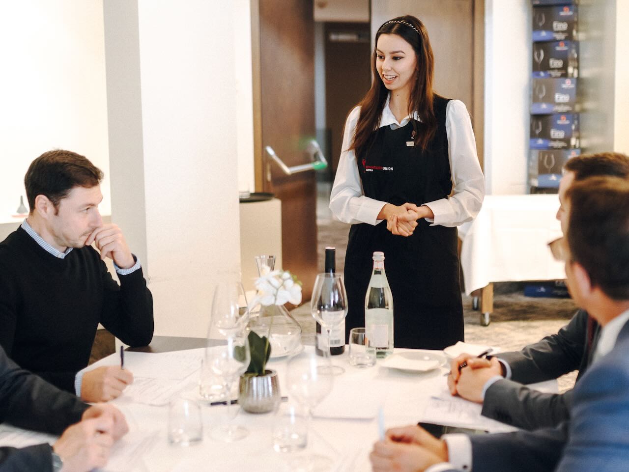 Als erste Aufgabe galt es einen umfassenden Fragebogen auszufüllen, der etwa die klassifizierten Rebsorten österreichischer DAC-Gebiete, das Benennen von Flaschengrößen, das Verorten von namhaften Rieden inklusive Winzer*in, Kellertechnik und allgemeine Getränkekunde umfasste. Beim praktischen Teil war eine Flasche Rotwein zu servieren und auf den kniffligen Änderungswunsch eines Gastes einzugehen.