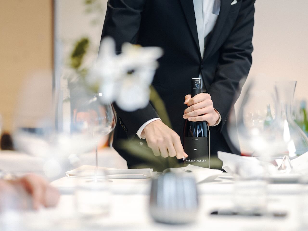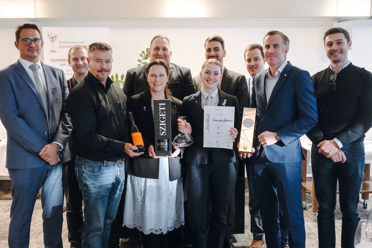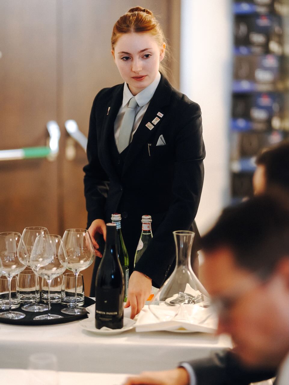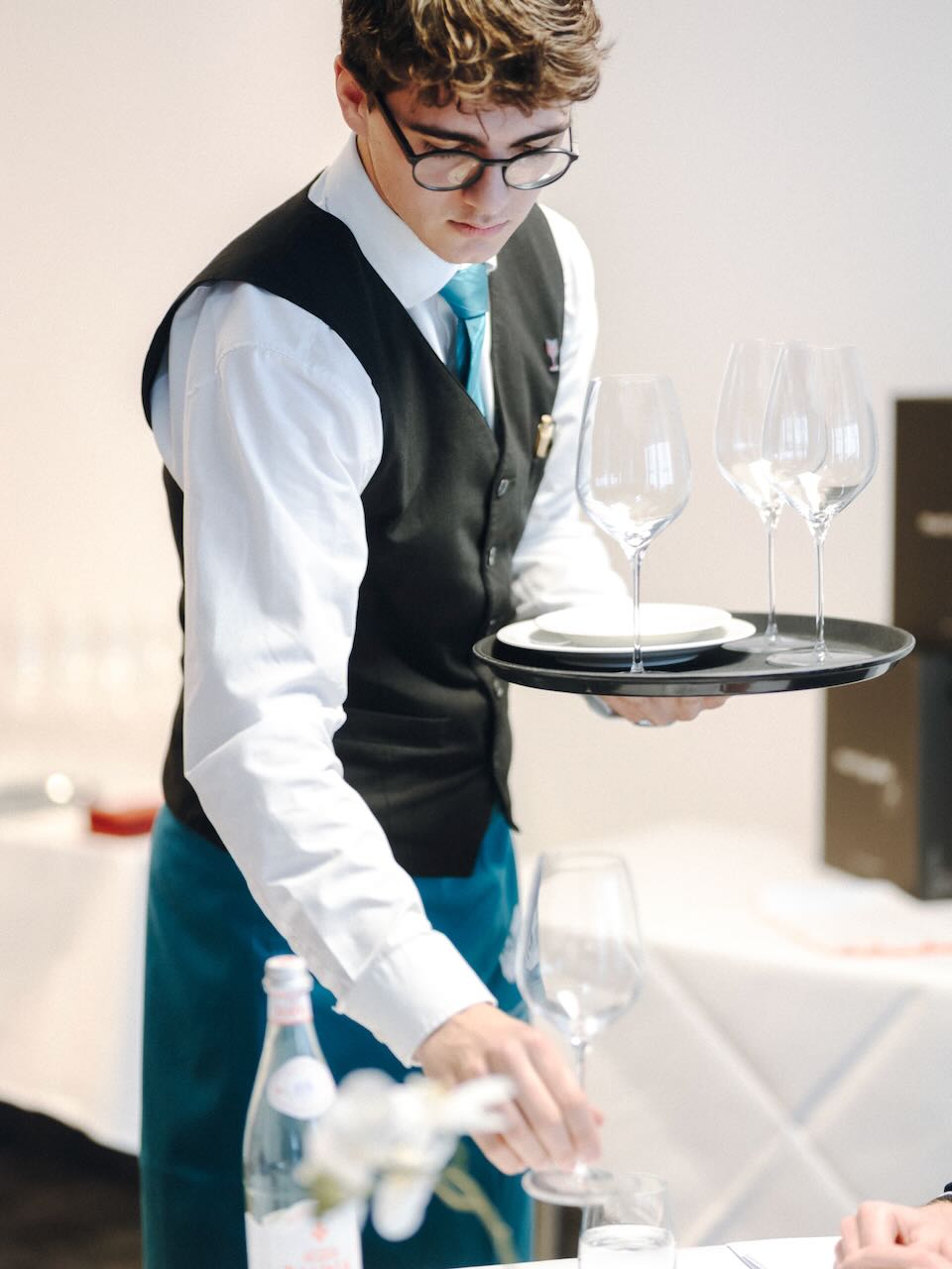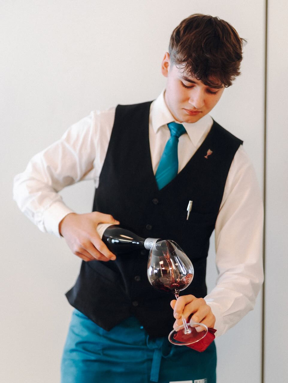 Als erste Aufgabe galt es einen umfassenden Fragebogen auszufüllen, der etwa die klassifizierten Rebsorten österreichischer DAC-Gebiete, das Benennen von Flaschengrößen, das Verorten von namhaften Rieden inklusive Winzer*in, Kellertechnik und allgemeine Getränkekunde umfasste. Beim praktischen Teil war eine Flasche Rotwein zu servieren und auf den kniffligen Änderungswunsch eines Gastes einzugehen.