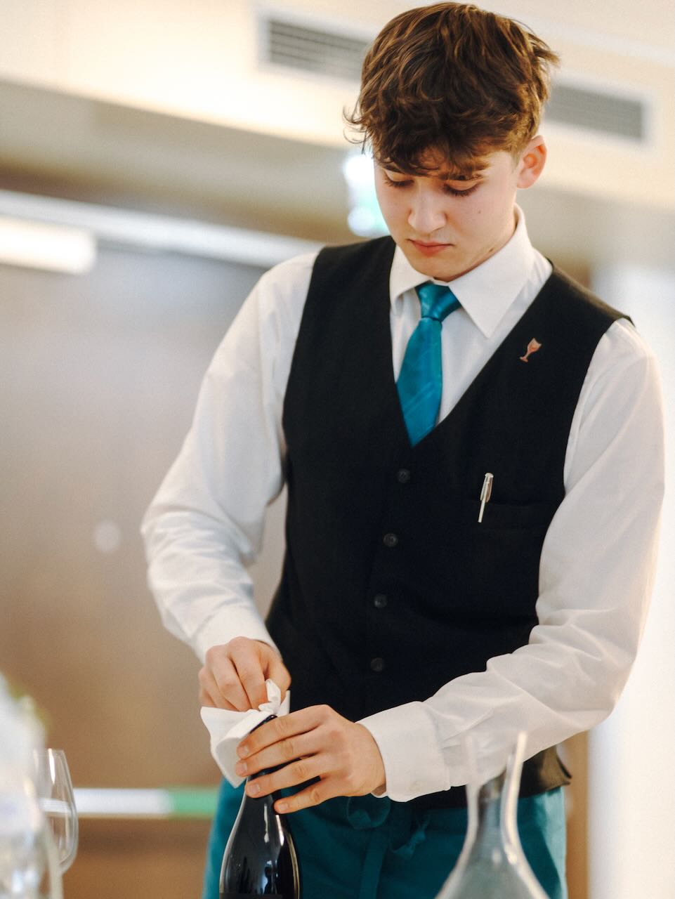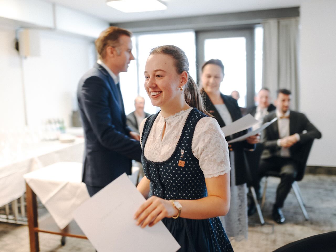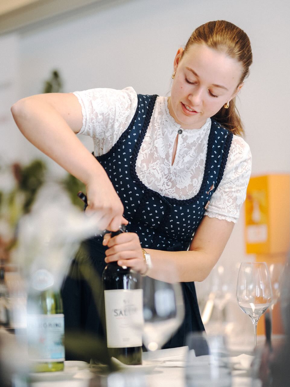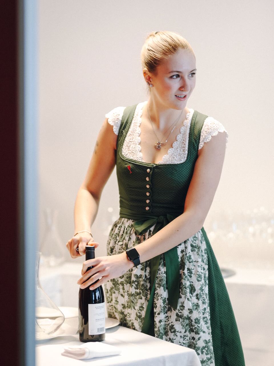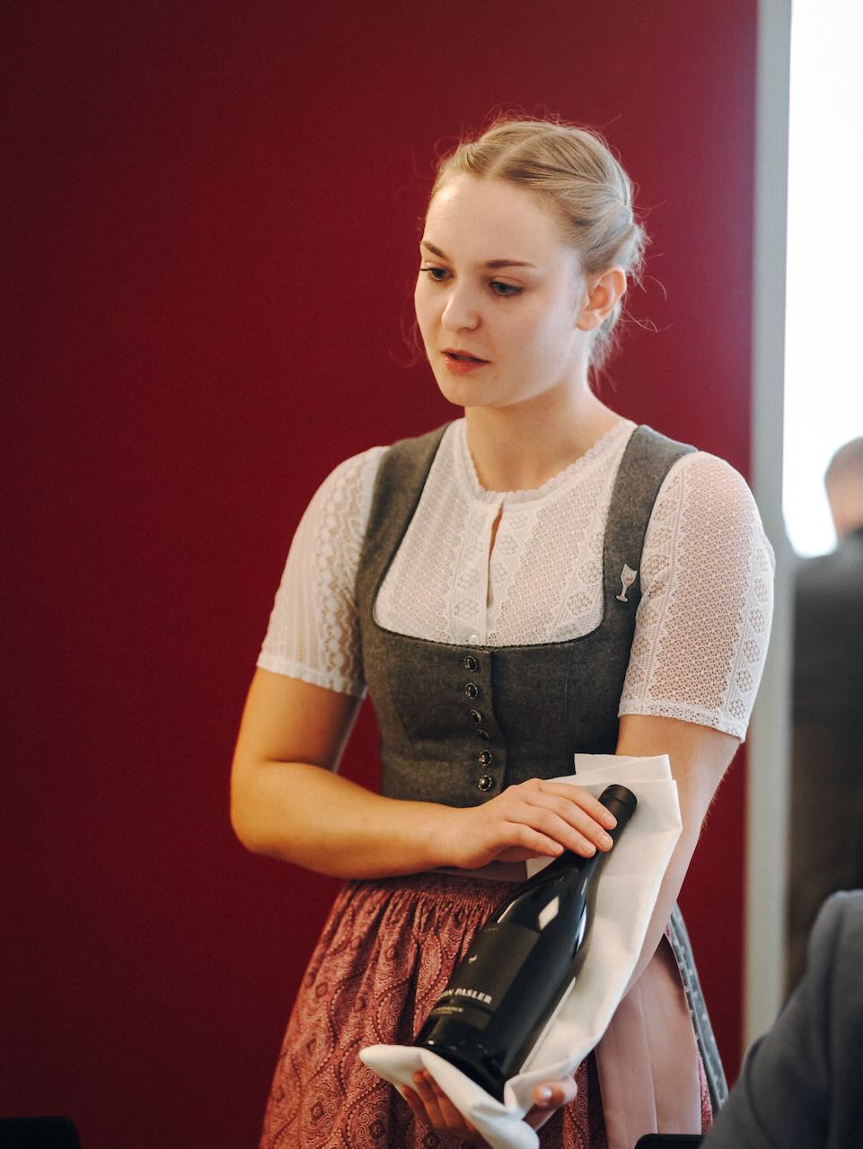 Als erste Aufgabe galt es einen umfassenden Fragebogen auszufüllen, der etwa die klassifizierten Rebsorten österreichischer DAC-Gebiete, das Benennen von Flaschengrößen, das Verorten von namhaften Rieden inklusive Winzer*in, Kellertechnik und allgemeine Getränkekunde umfasste. Beim praktischen Teil war eine Flasche Rotwein zu servieren und auf den kniffligen Änderungswunsch eines Gastes einzugehen.