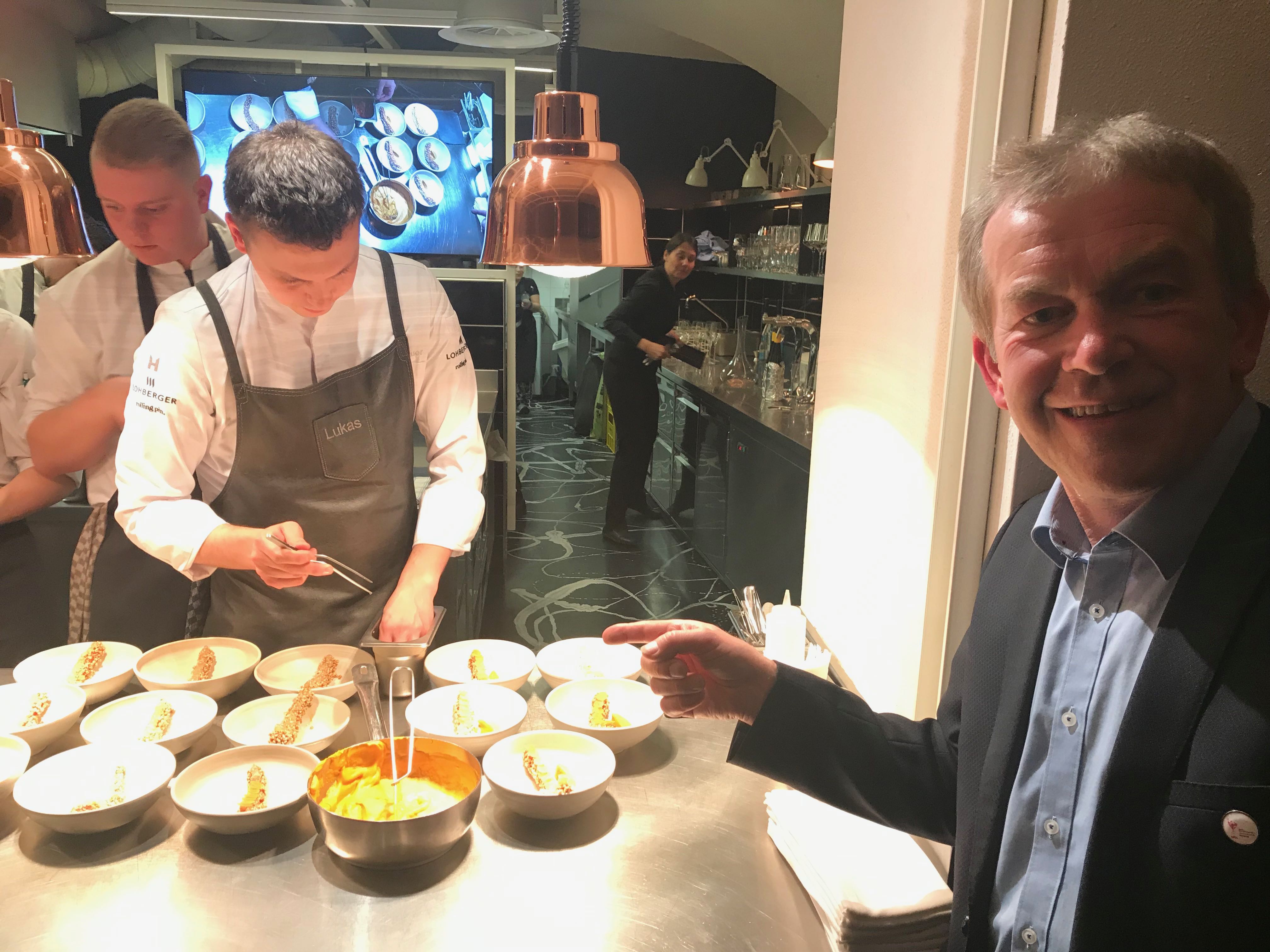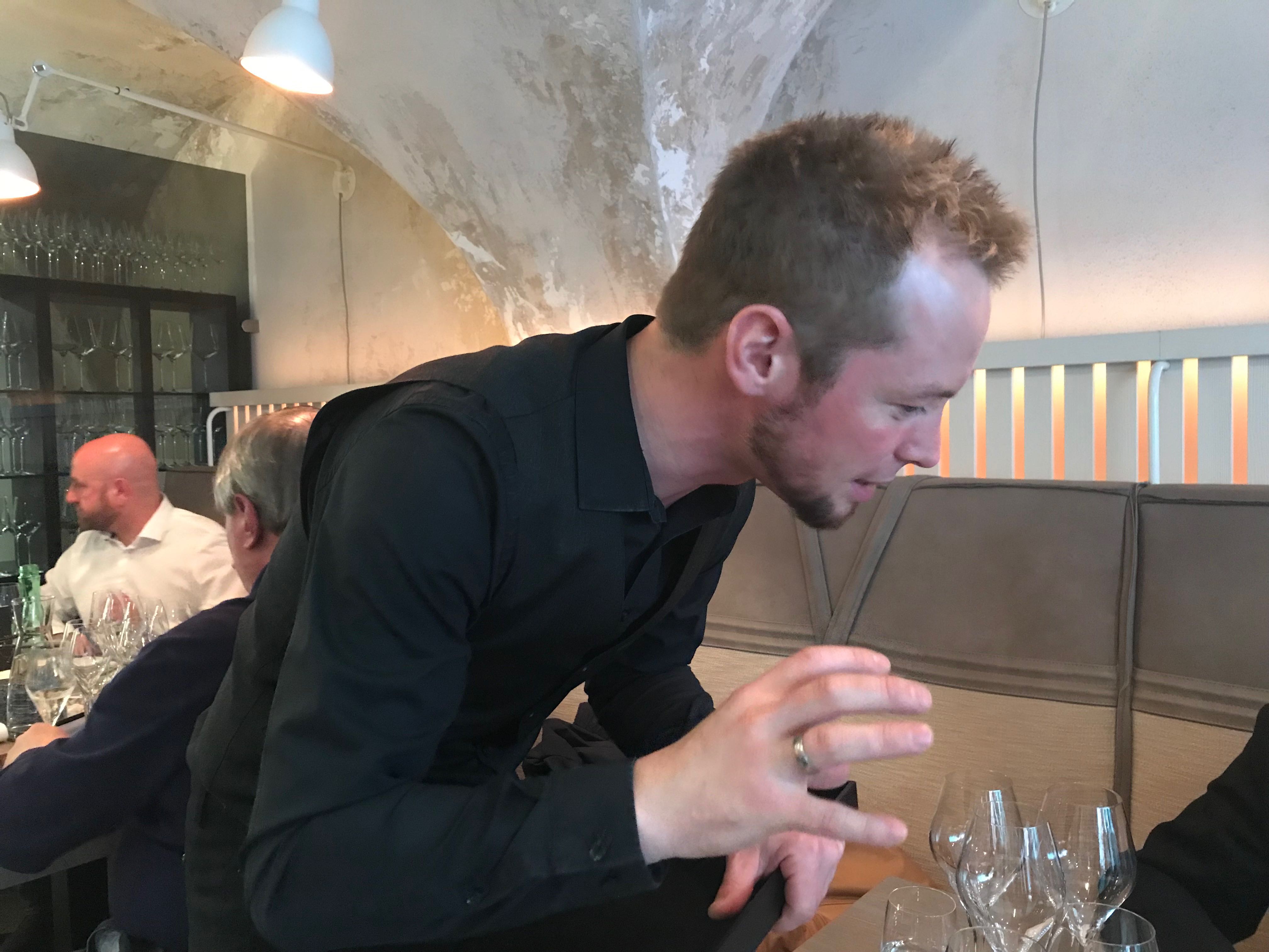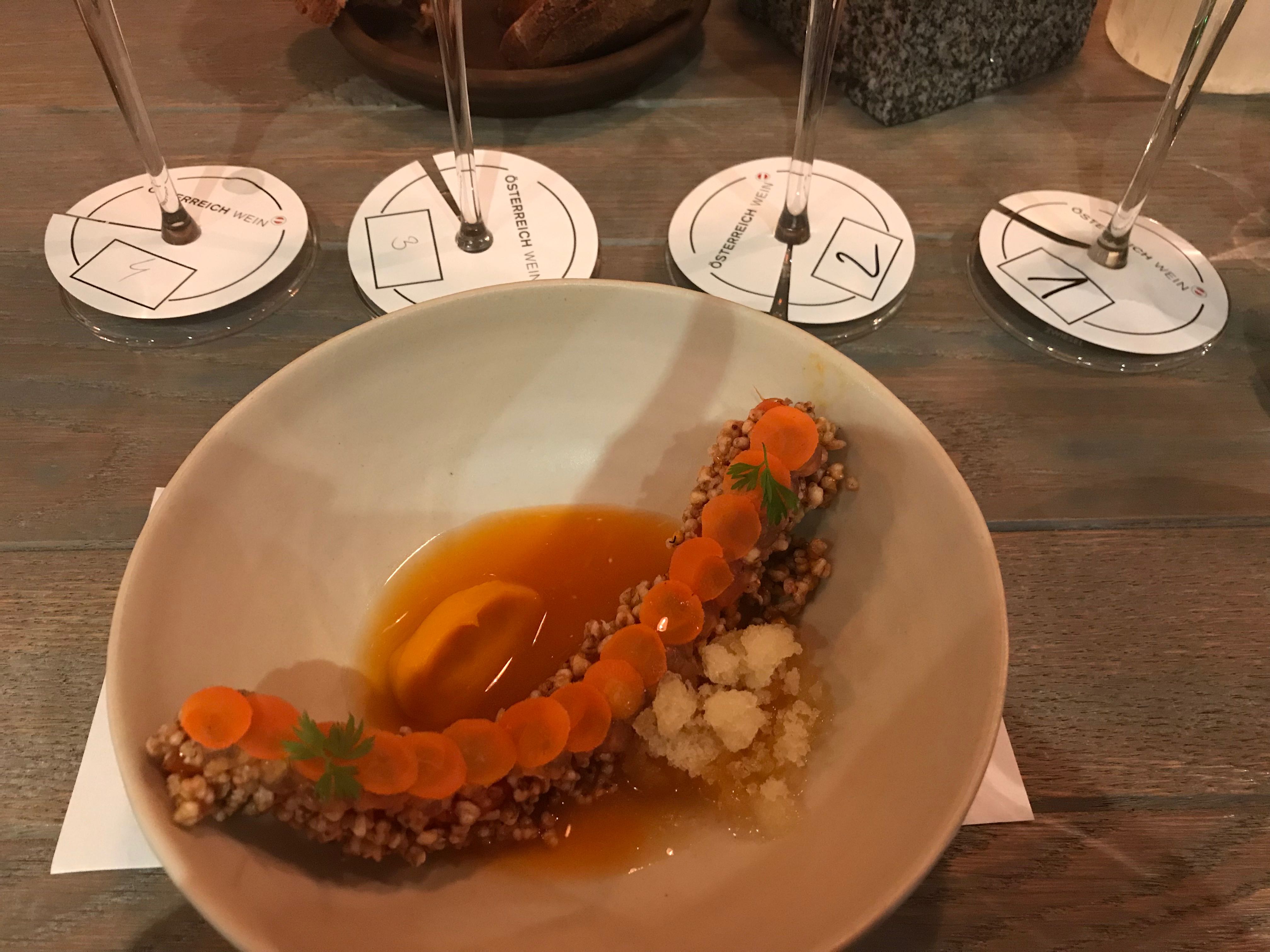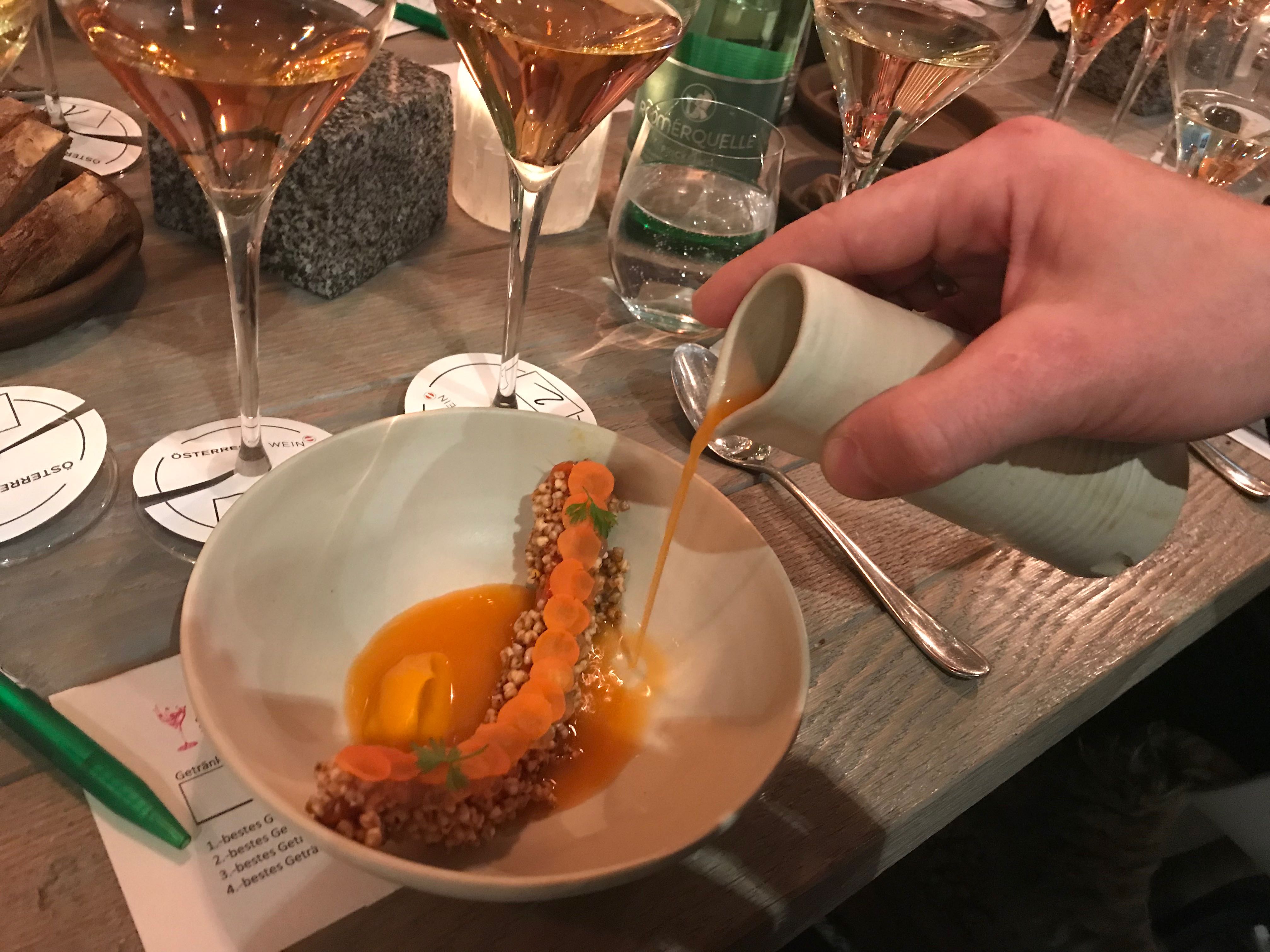 Beim zweiten Gang mit Karotte-Kamille-Buchweizen punktete der Rote Veltliner vom Weingut Hofbauer-Schmidt beim Publikum, gereicht vom Sommelier-Vertreter des Mühlviertels, Michael Obermüller.