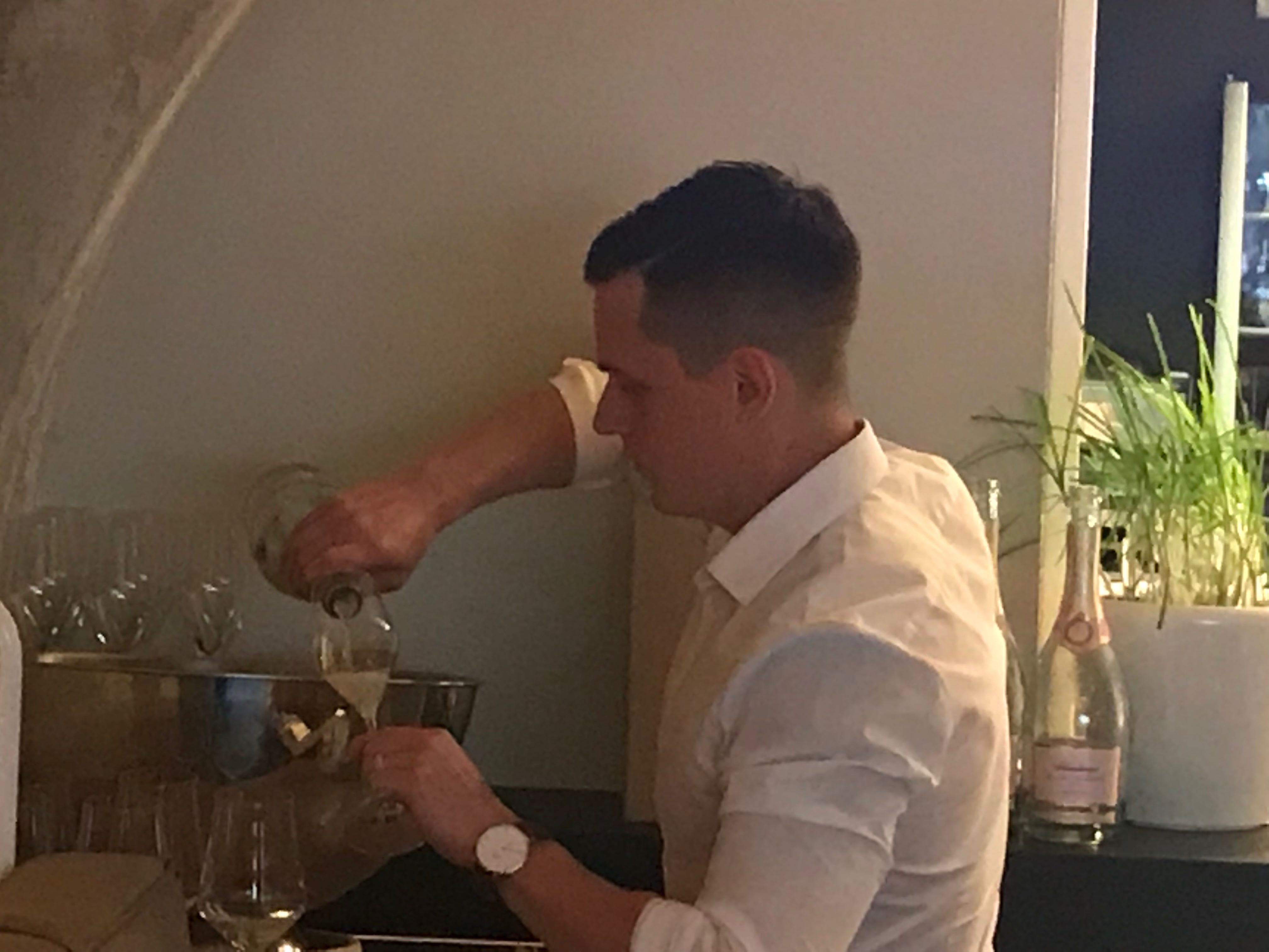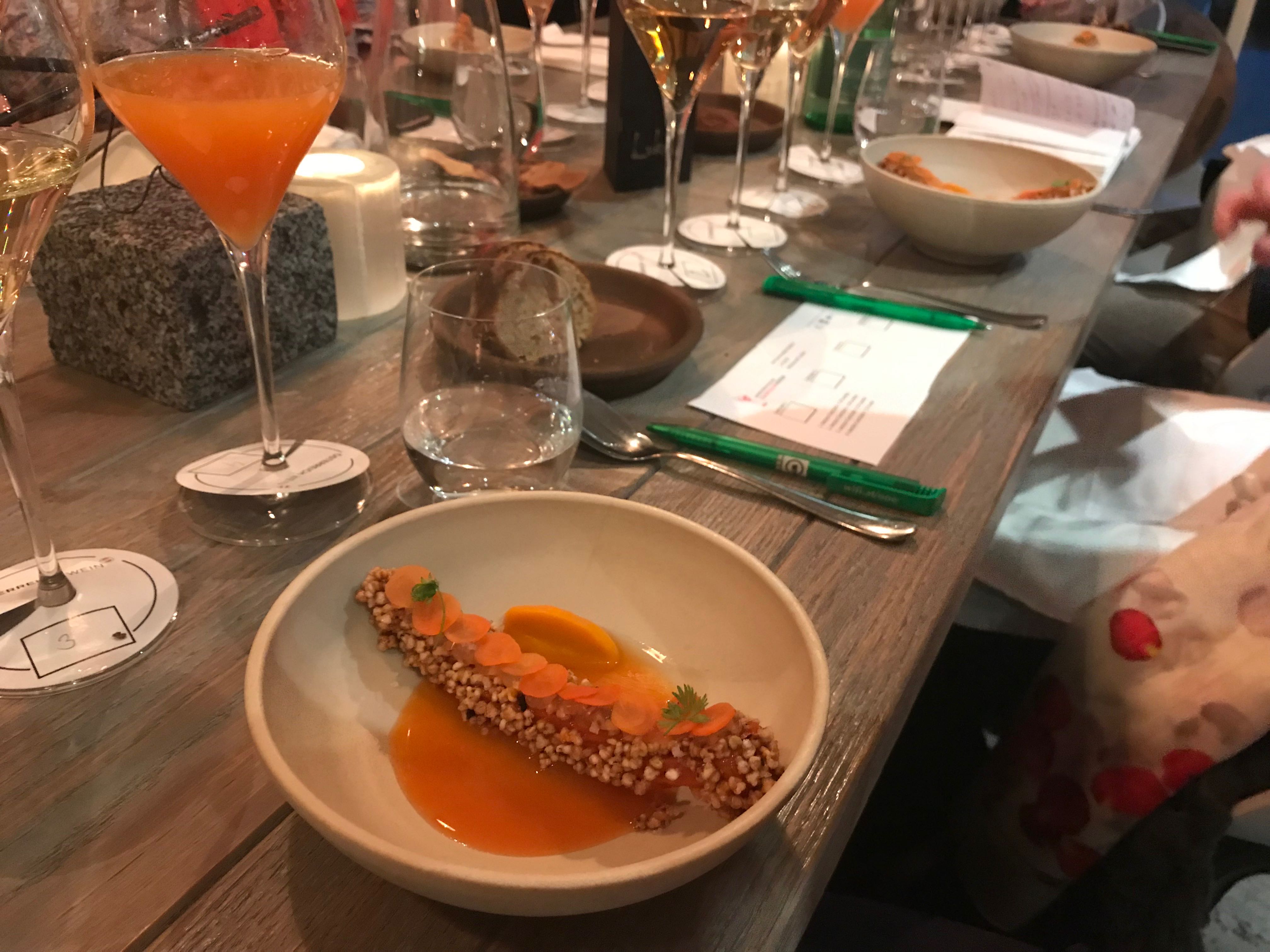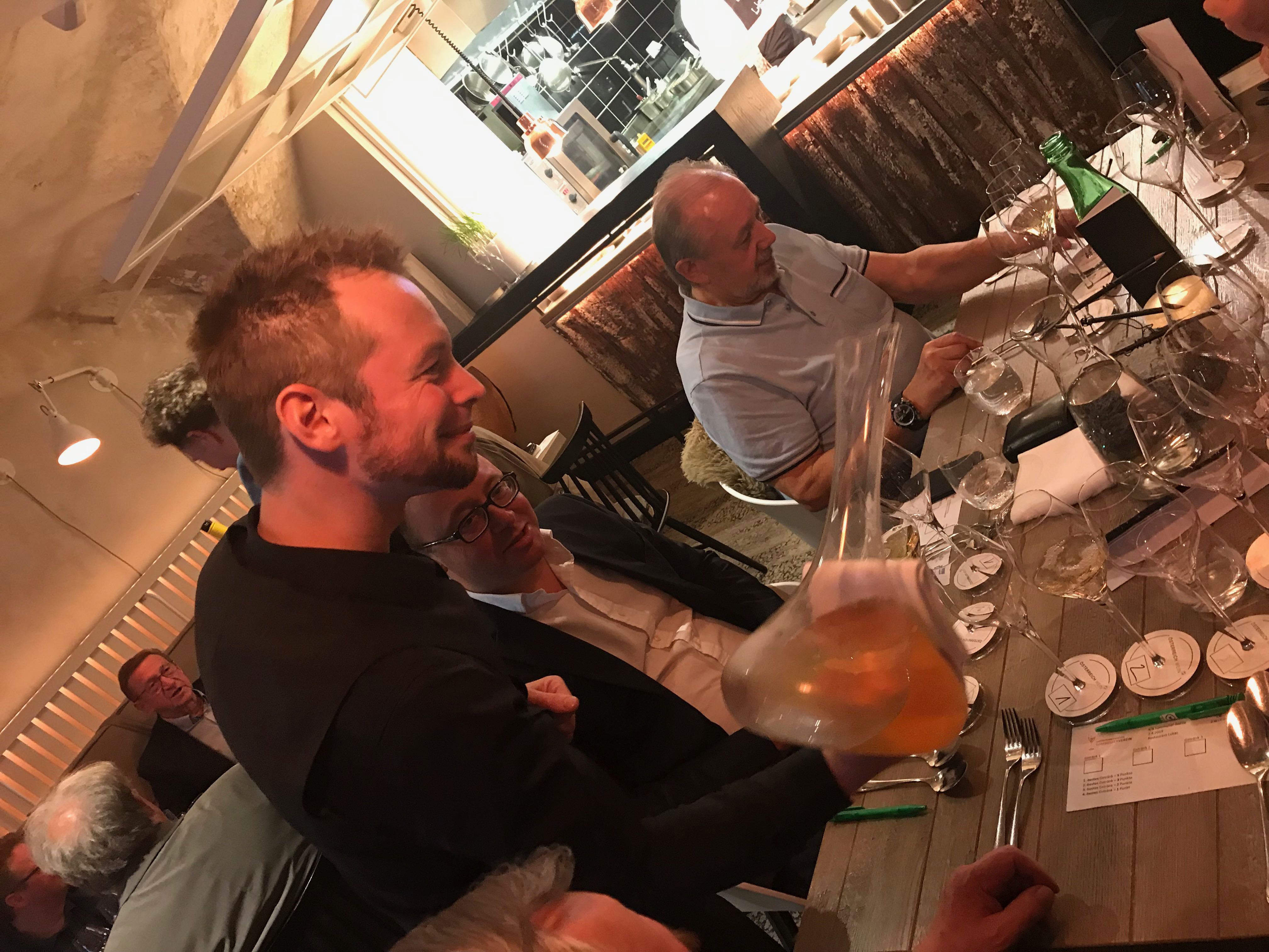 Beim zweiten Gang mit Karotte-Kamille-Buchweizen punktete der Rote Veltliner vom Weingut Hofbauer-Schmidt beim Publikum, gereicht vom Sommelier-Vertreter des Mühlviertels, Michael Obermüller.
