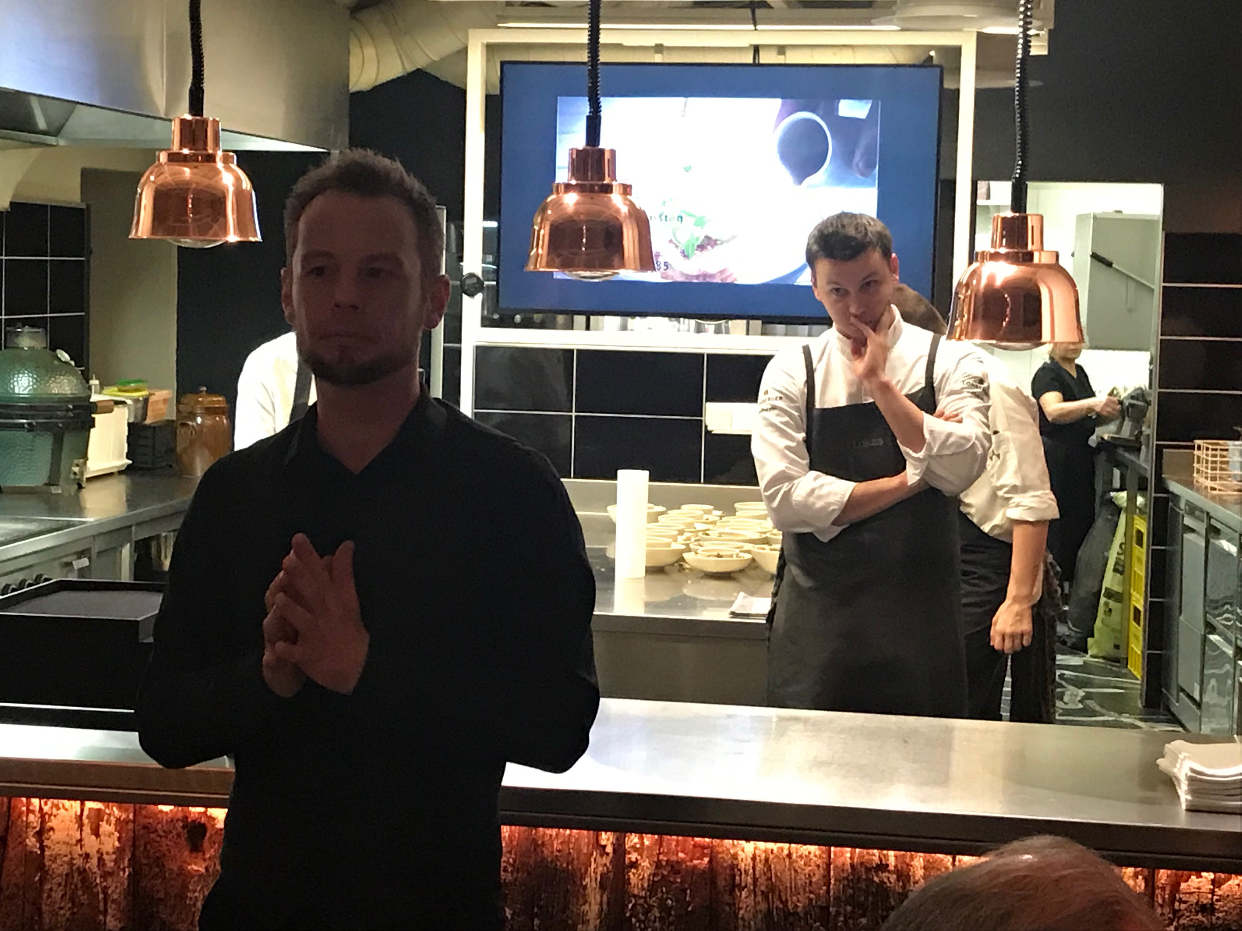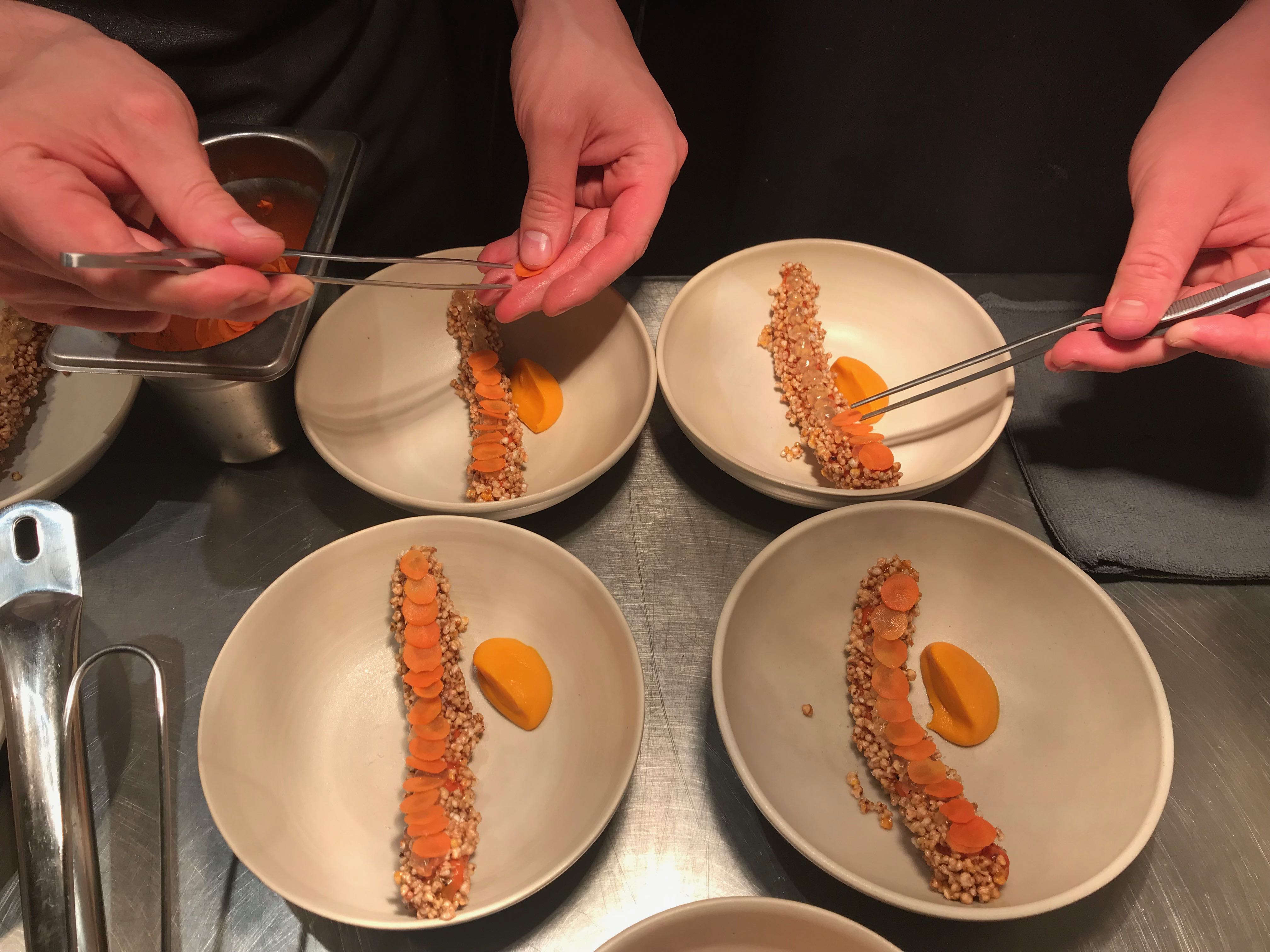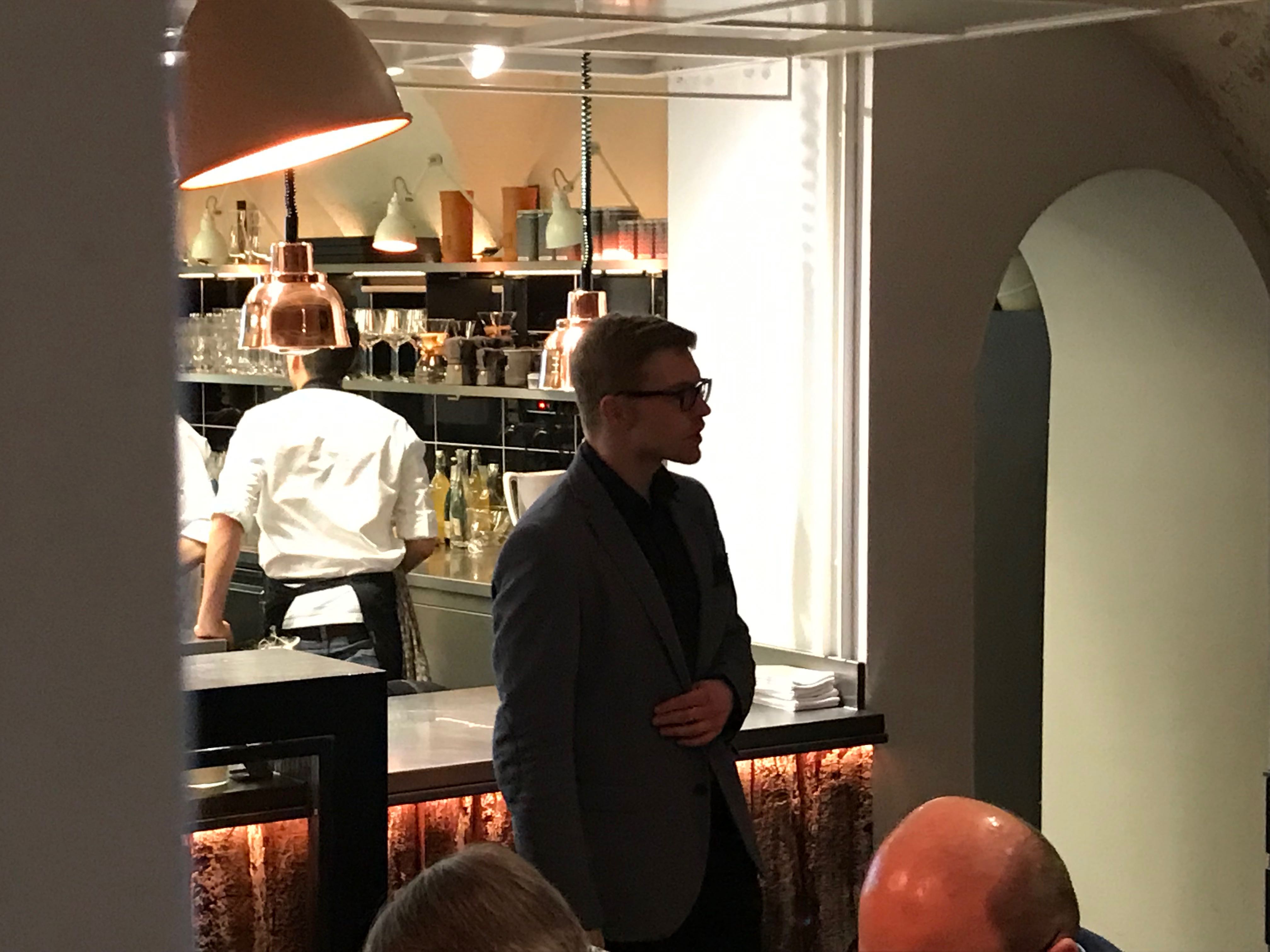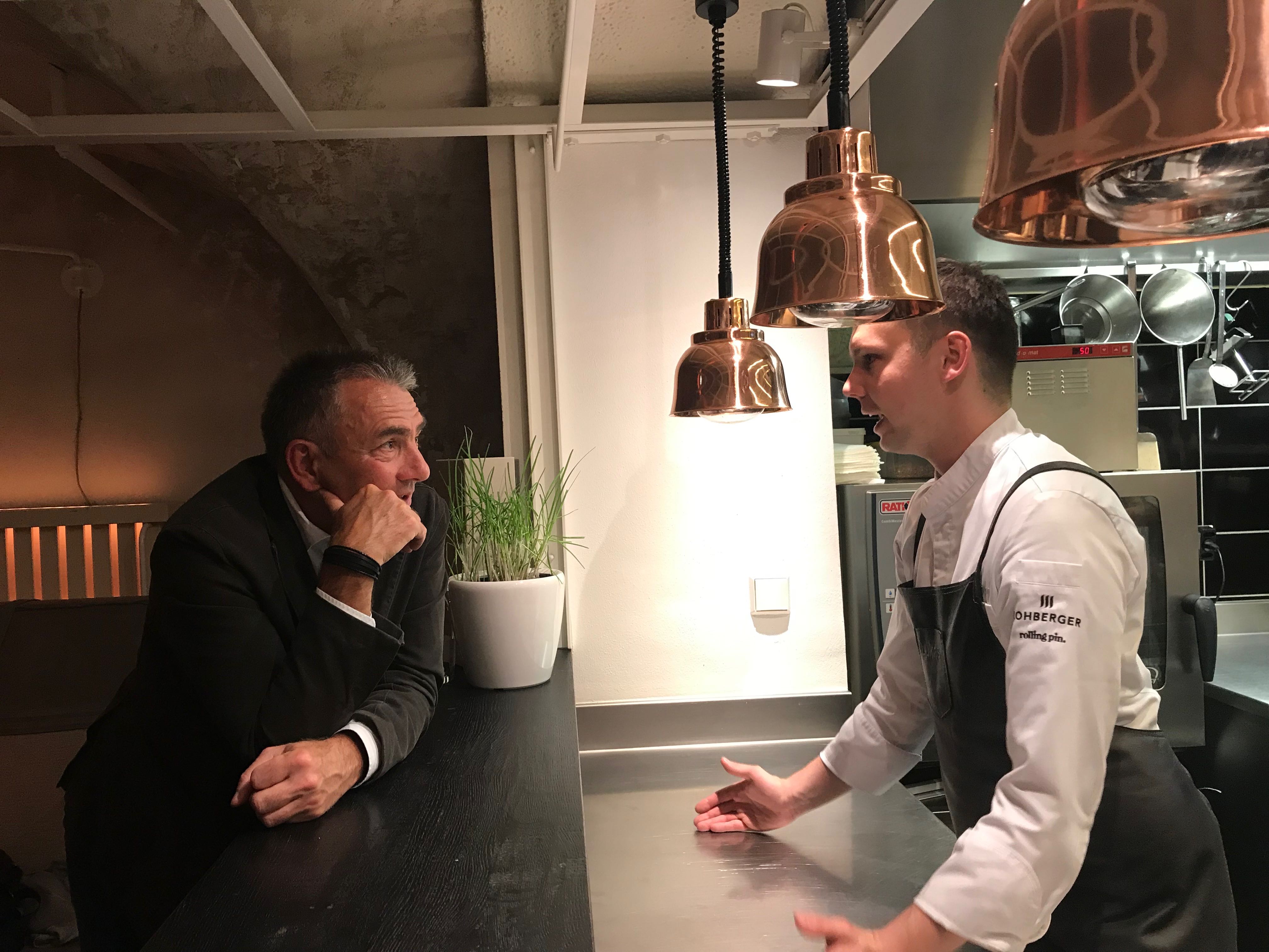Beim zweiten Gang mit Karotte-Kamille-Buchweizen punktete der Rote Veltliner vom Weingut Hofbauer-Schmidt beim Publikum, gereicht vom Sommelier-Vertreter des Mühlviertels, Michael Obermüller.