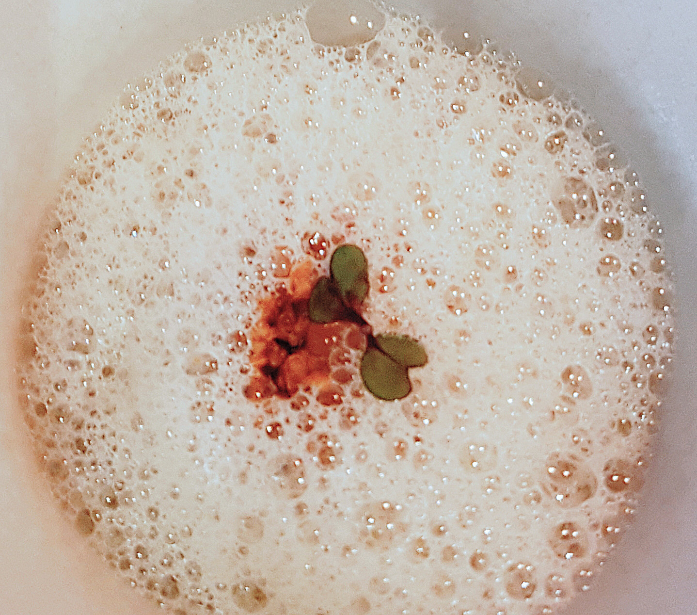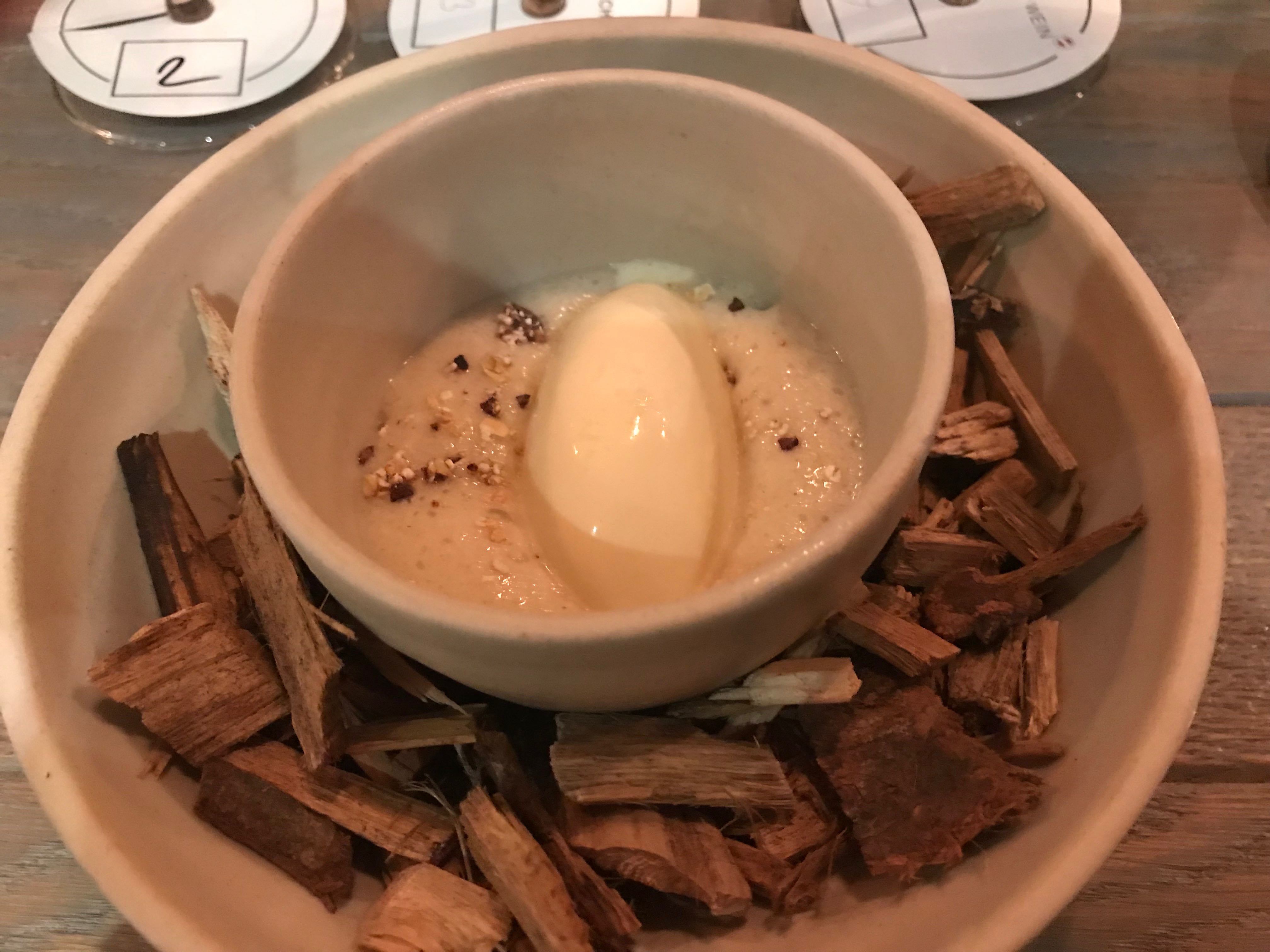 Reismilch mit Grünem Tee und Jasmin dazu Kaffir Limettenblatt, Zitronenzeste, Zitronensaft, Verjus und Hollunderblütensirup