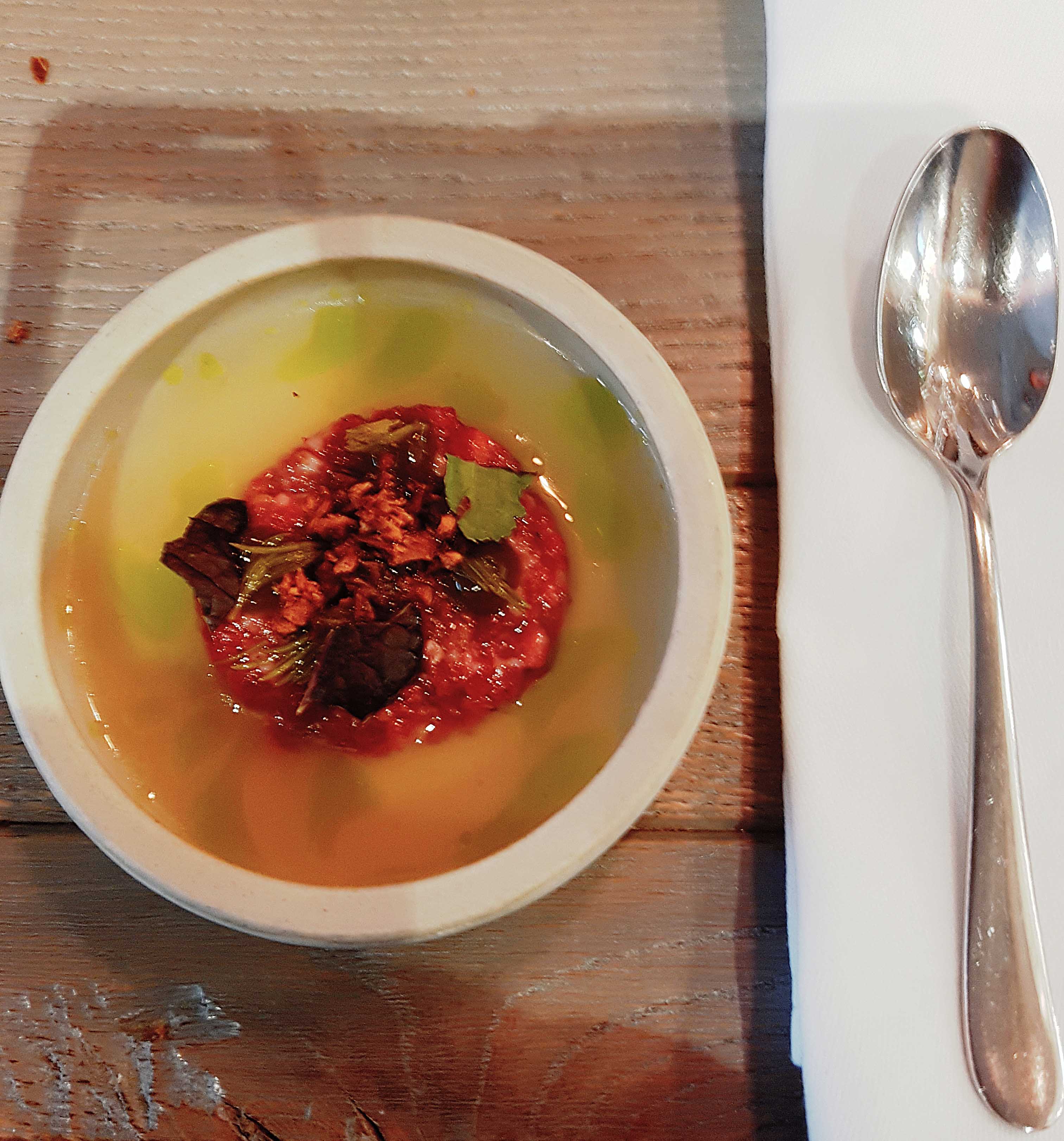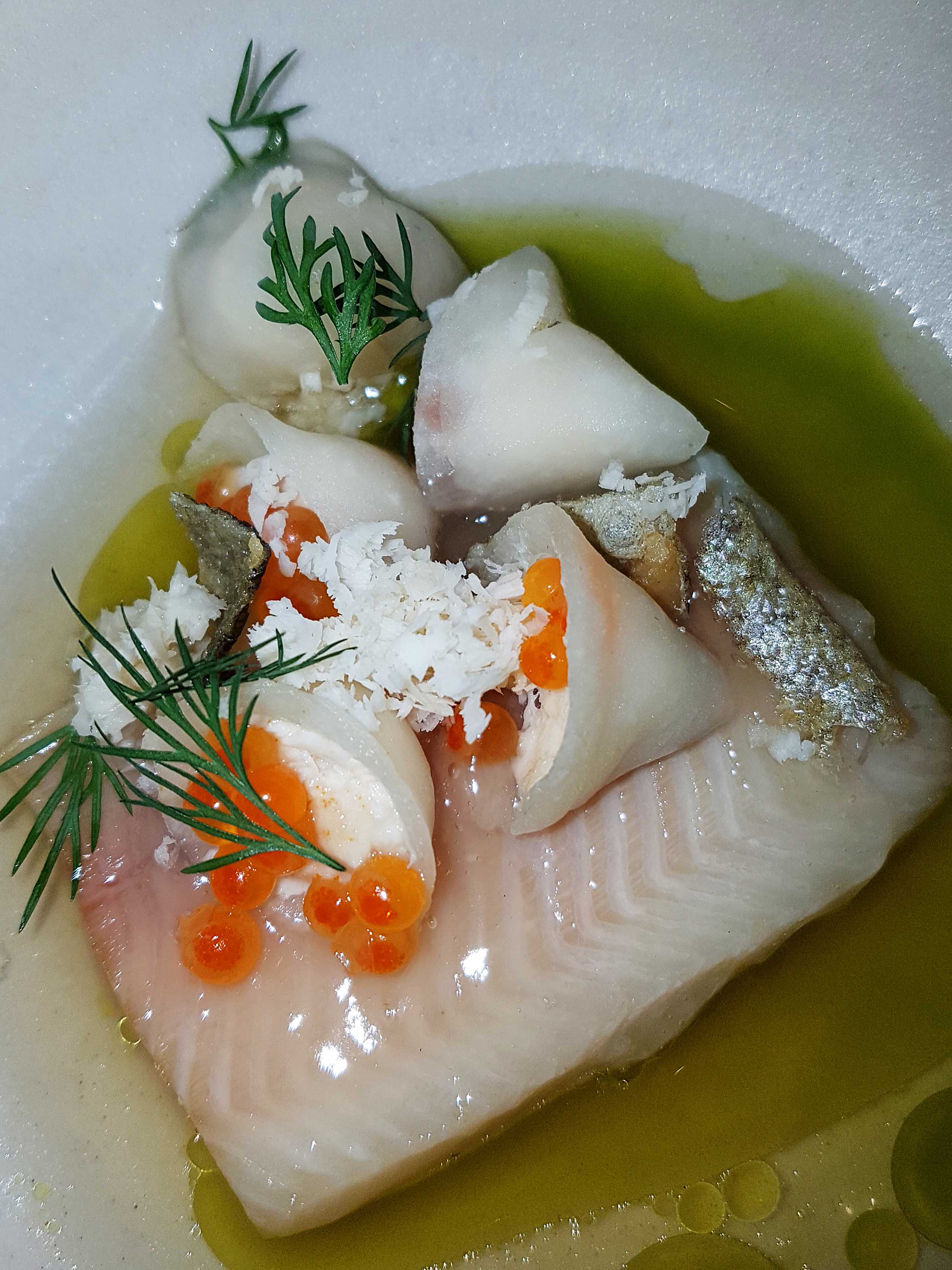 Als erster Gang wurde Forelle-Dill-Kohlrabi gereicht und zur Überraschung vieler schmeckte mit großer Deutlichkeit weder Riesling noch Rotgipfler dazu am besten, sondern von Patron Heinz Grabmer (Waldschänke Grieskirchen) ausgewählter Gin Tonic mit Dill und Rhabarber.